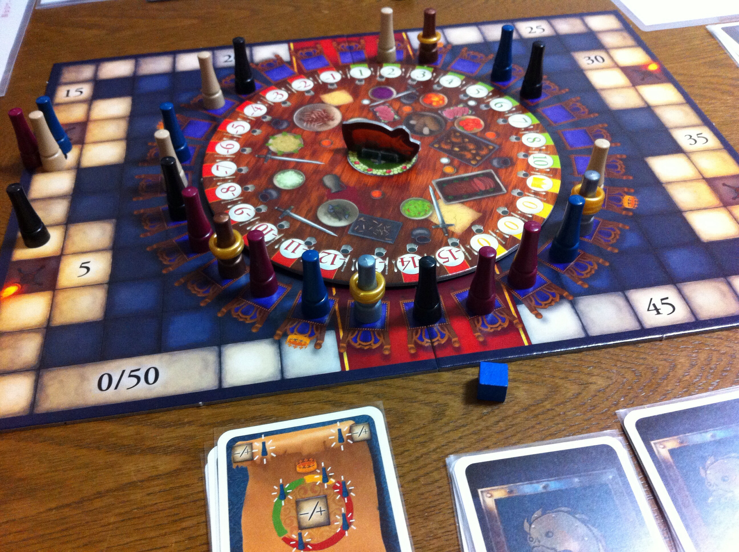 ゲームプレイ中の図。円卓の全ての席には「+」と「-」の数字が書かれています。そして、そのままそれがプレイヤーの得られる点です。なのですが、この円卓、アーサー王を中心に開かれているものなので、アーサー王が動けば、円卓の席の得点も必然的にくるくる動きます!
