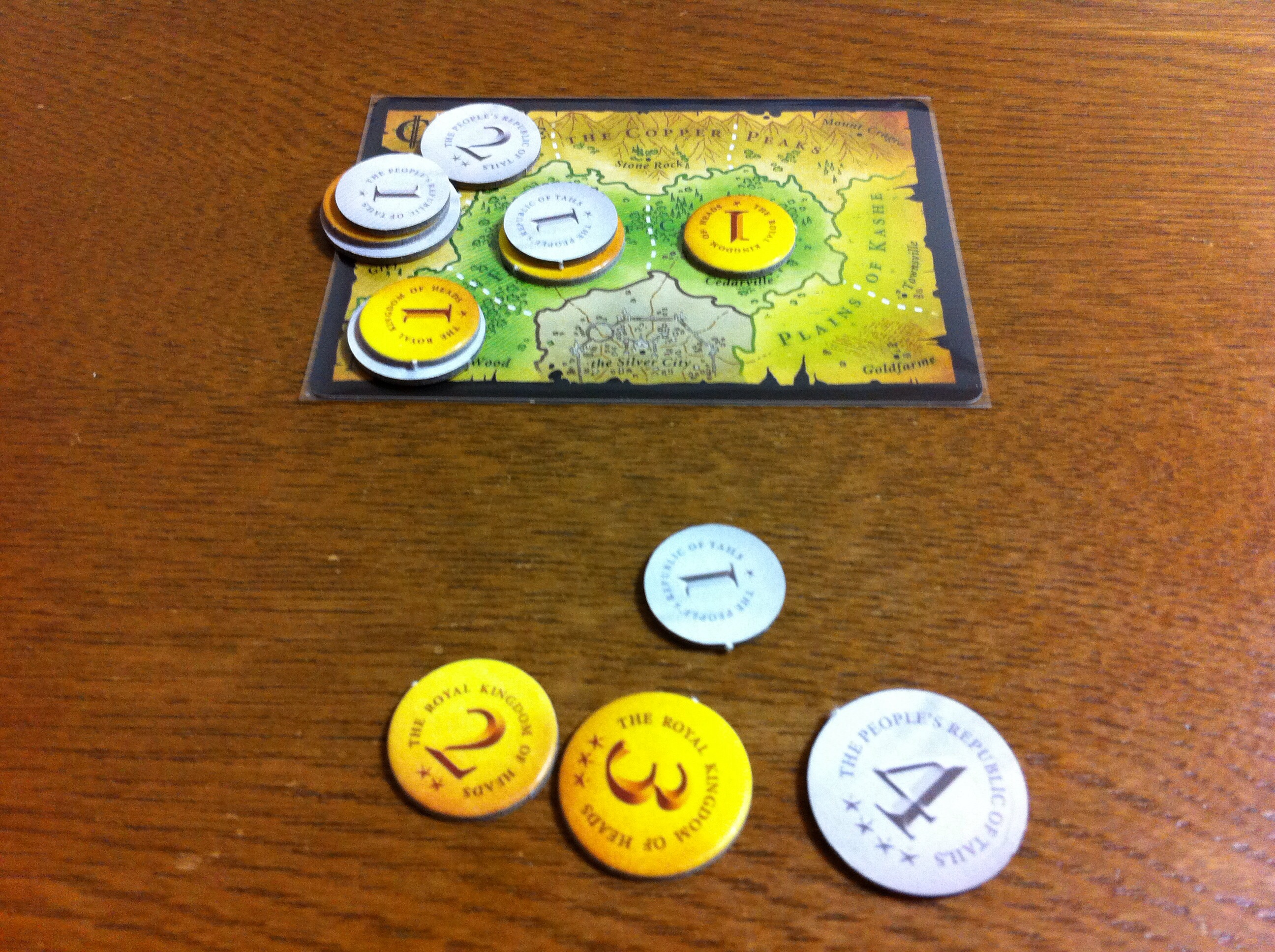 手番になったら、価値の違うコインを1つずつ手に取り、手の中でよくシャッフルしたら・・・そのまま机に叩きつけます!!(注:そのままサイコロを振るように落としても良いです)そして、自分側のコインが何枚表向きになっているかにより、それに対応するアクションを任意で選択→実行します。