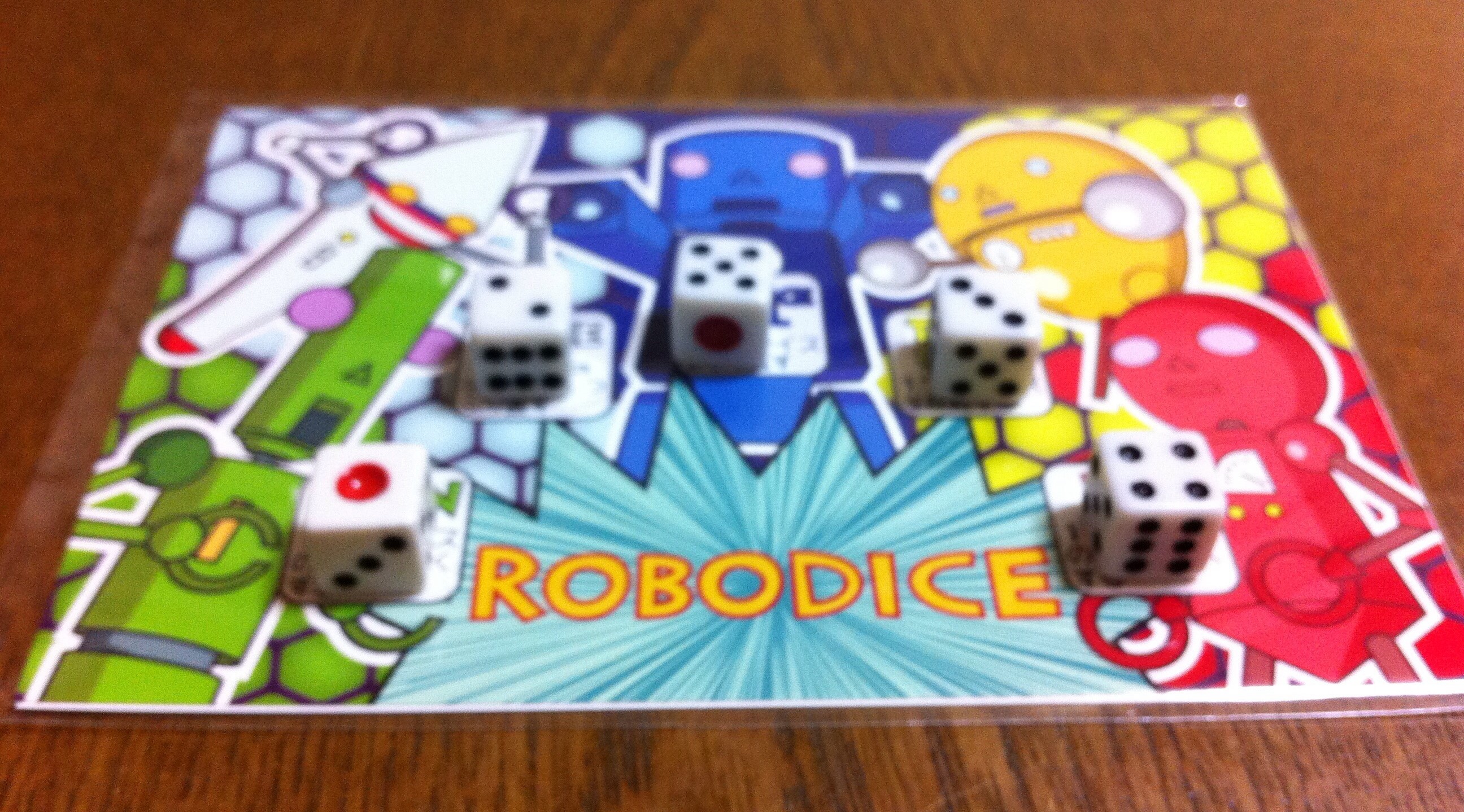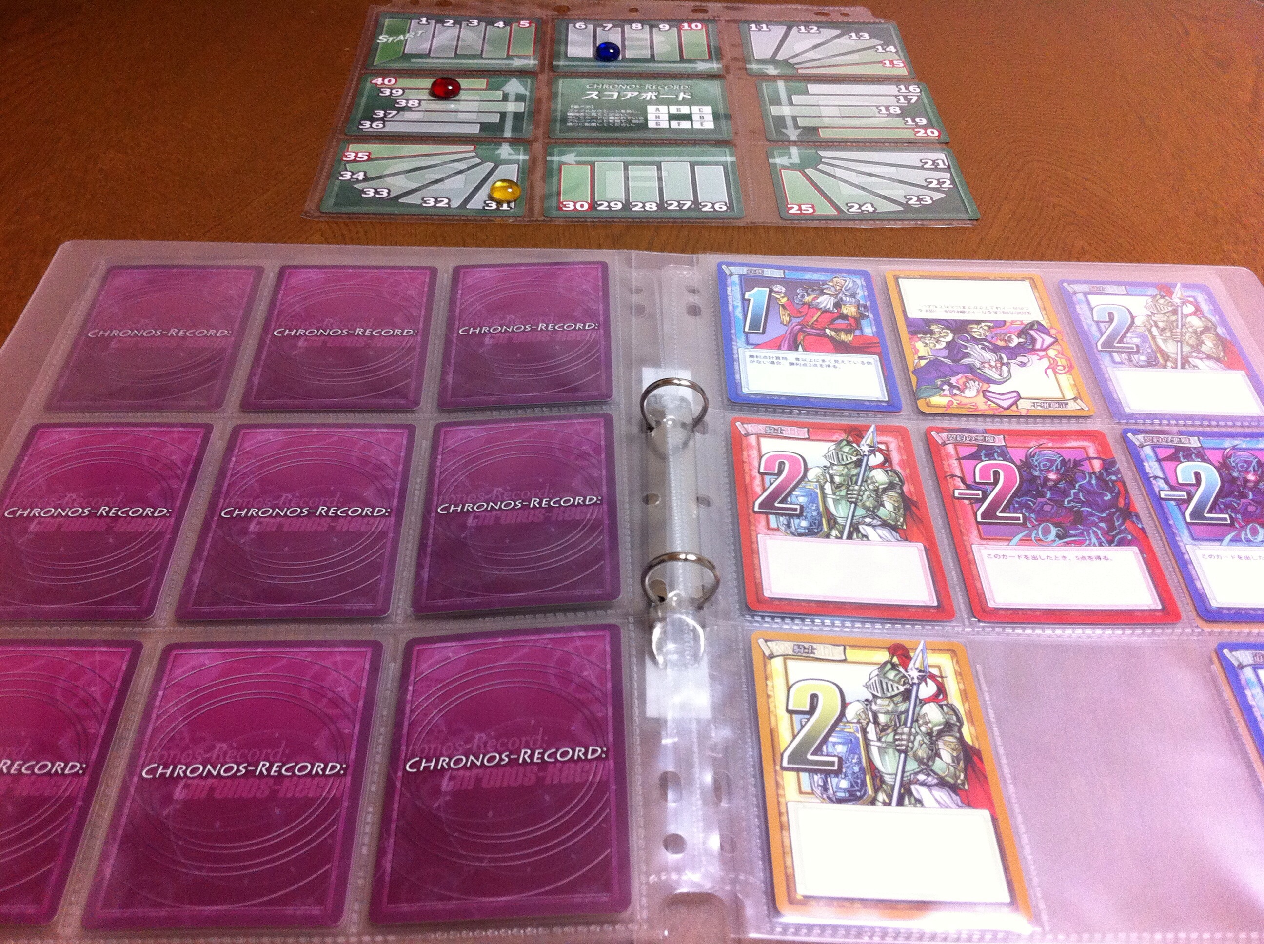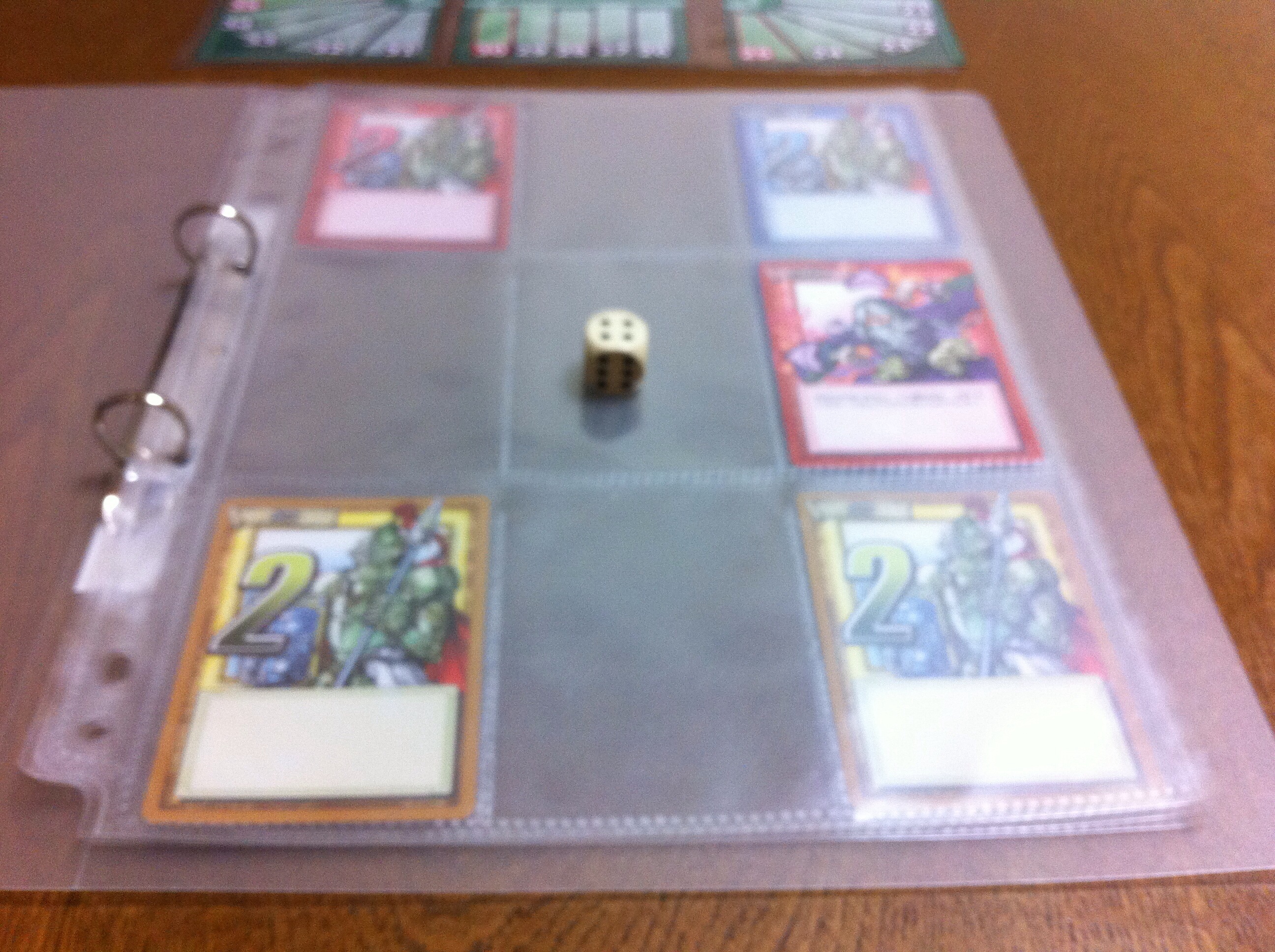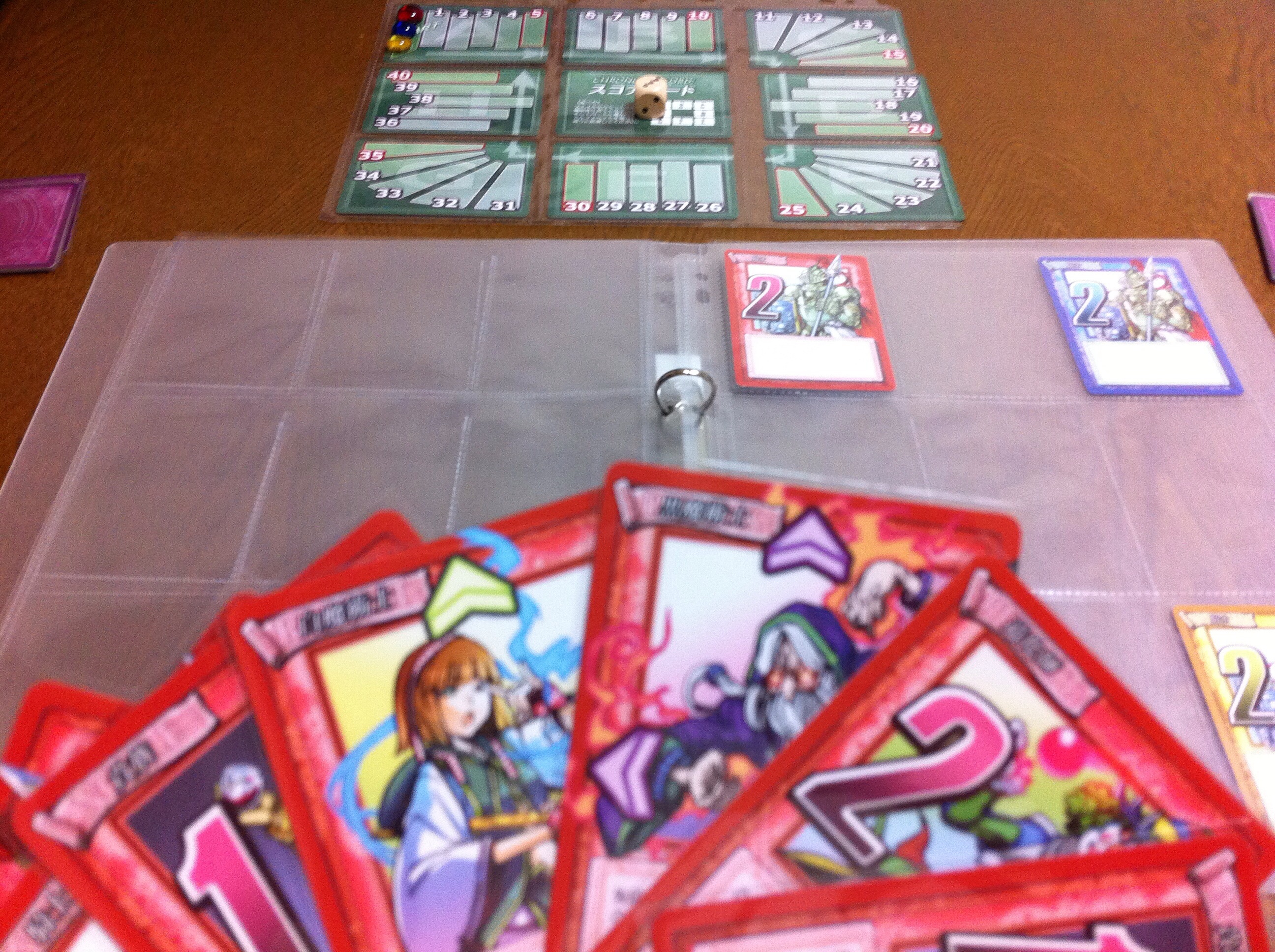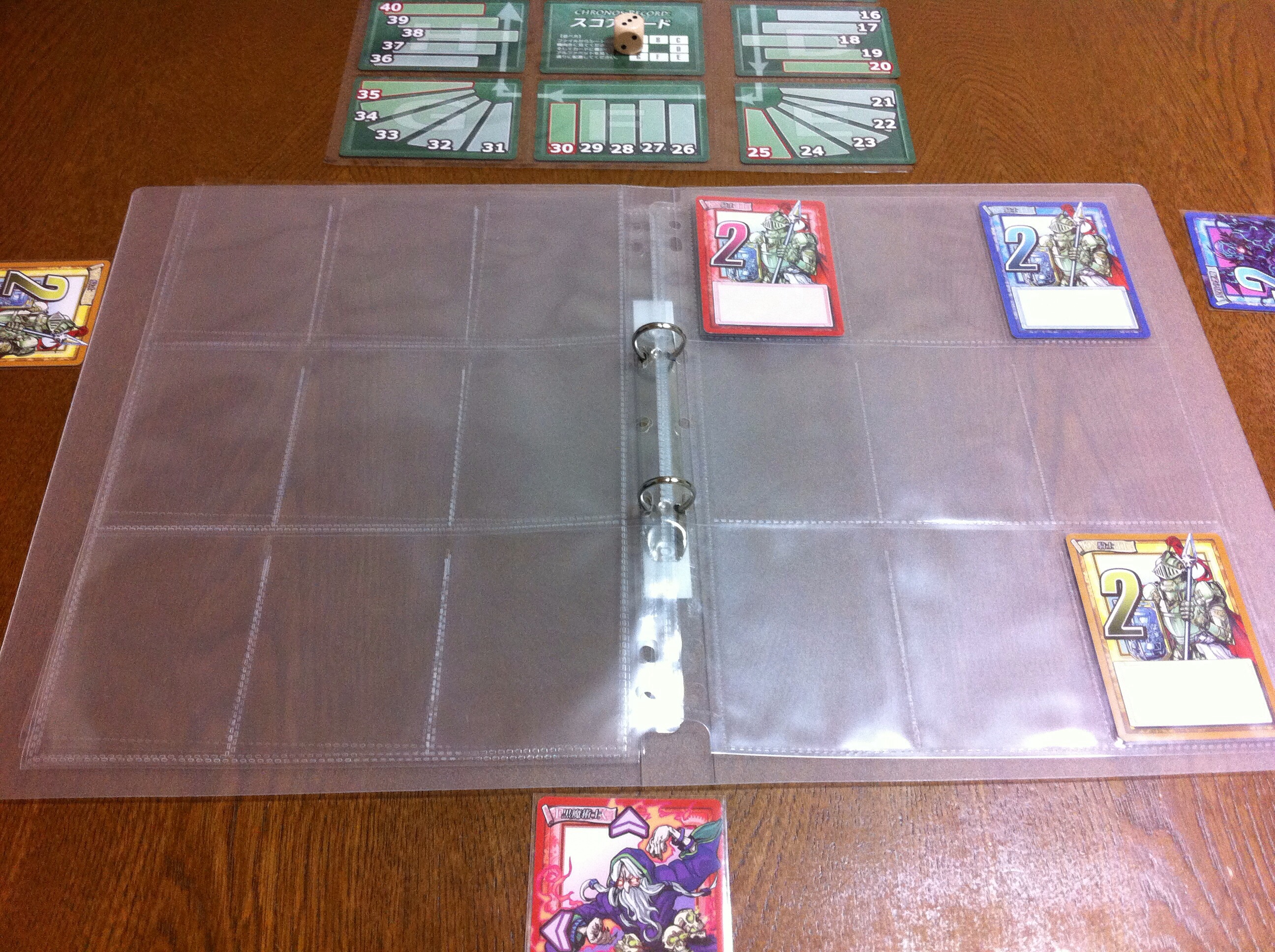 カードをファイルに入れたら、サイコロを振ります。出た目に応じてページをめくり、そこから見える全てのカードに書かれた点を得ます。下の図だと、黄は2+2=4点を得ました。