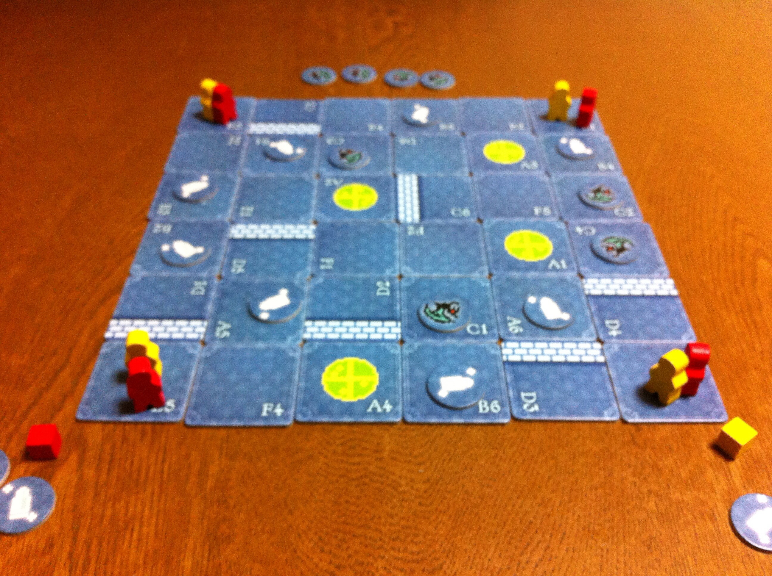 ゲームのスタートアップの図。照り返しが強くてよく見えませんが(汗)、テーブル中央の3枚のカードがオーダーカードで、このカードを達成して点を得るのが目的です!