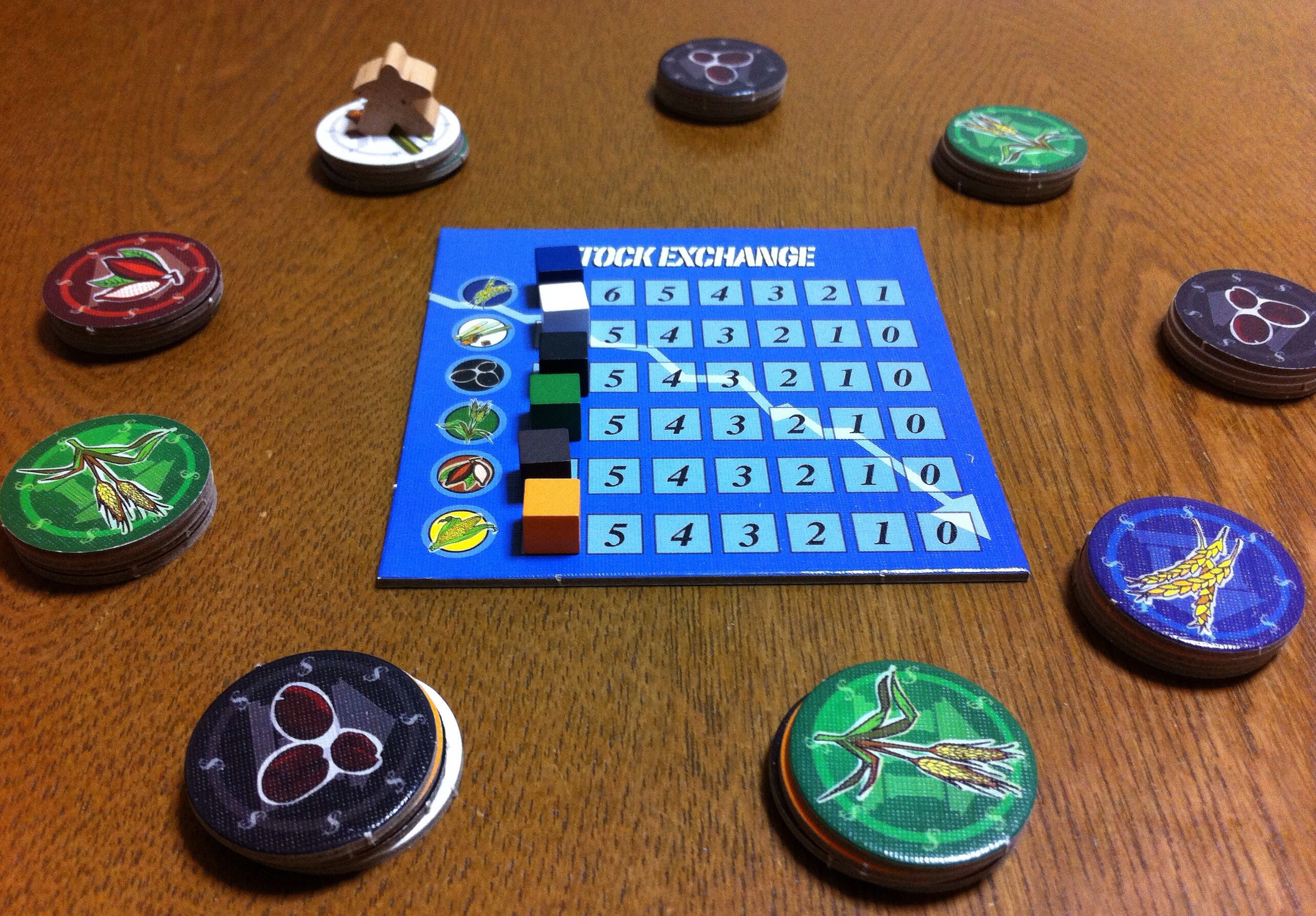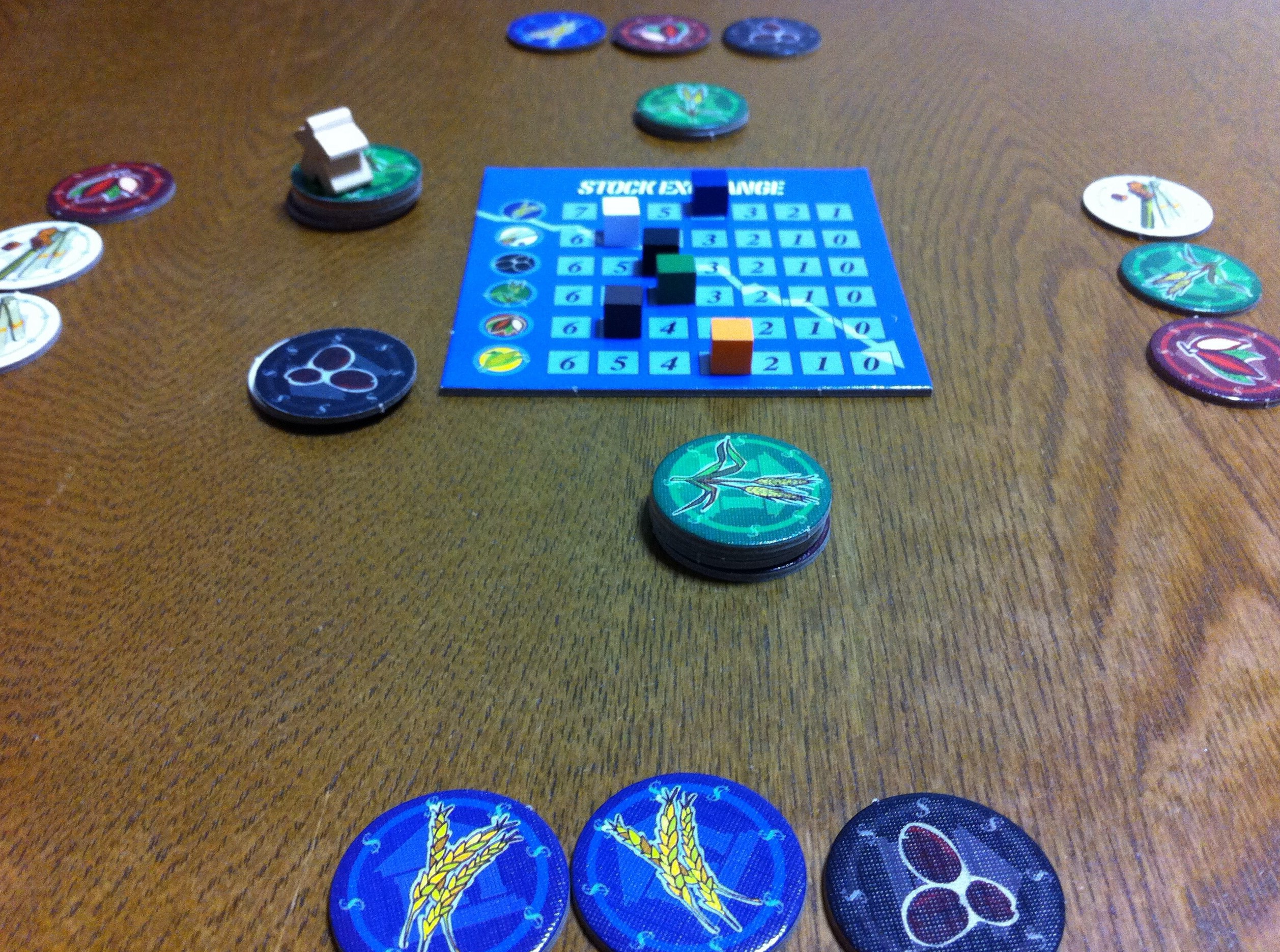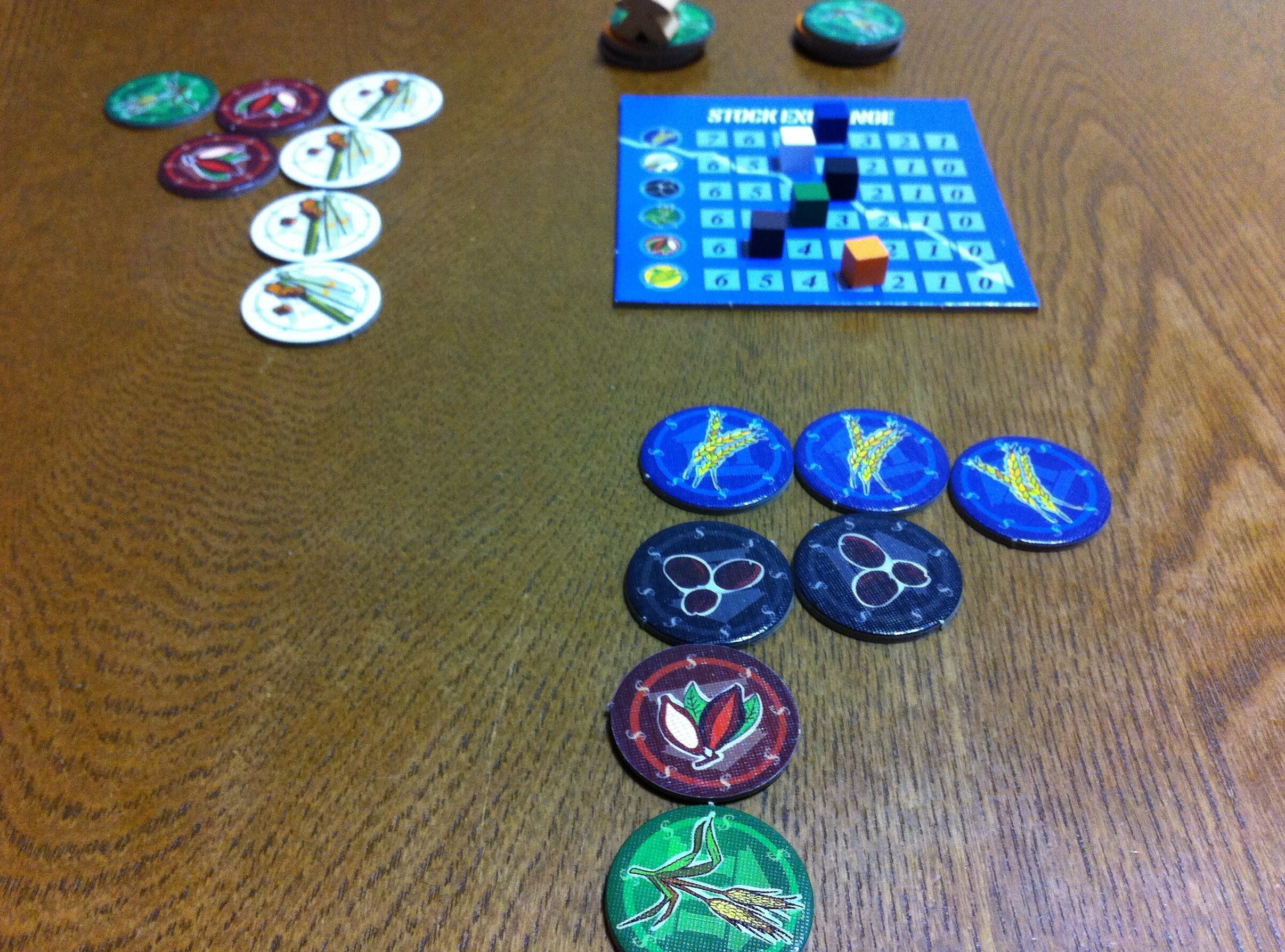 ゲーム終了の図。チーム戦だったので、それぞれ2人の確保したチップを合計しています。たとえば、手前のチームの得点は、青3×4=12、黒2×3=6、茶1×5=5、緑1×4=4の全てを合計し、12+6+5+4=27点です。