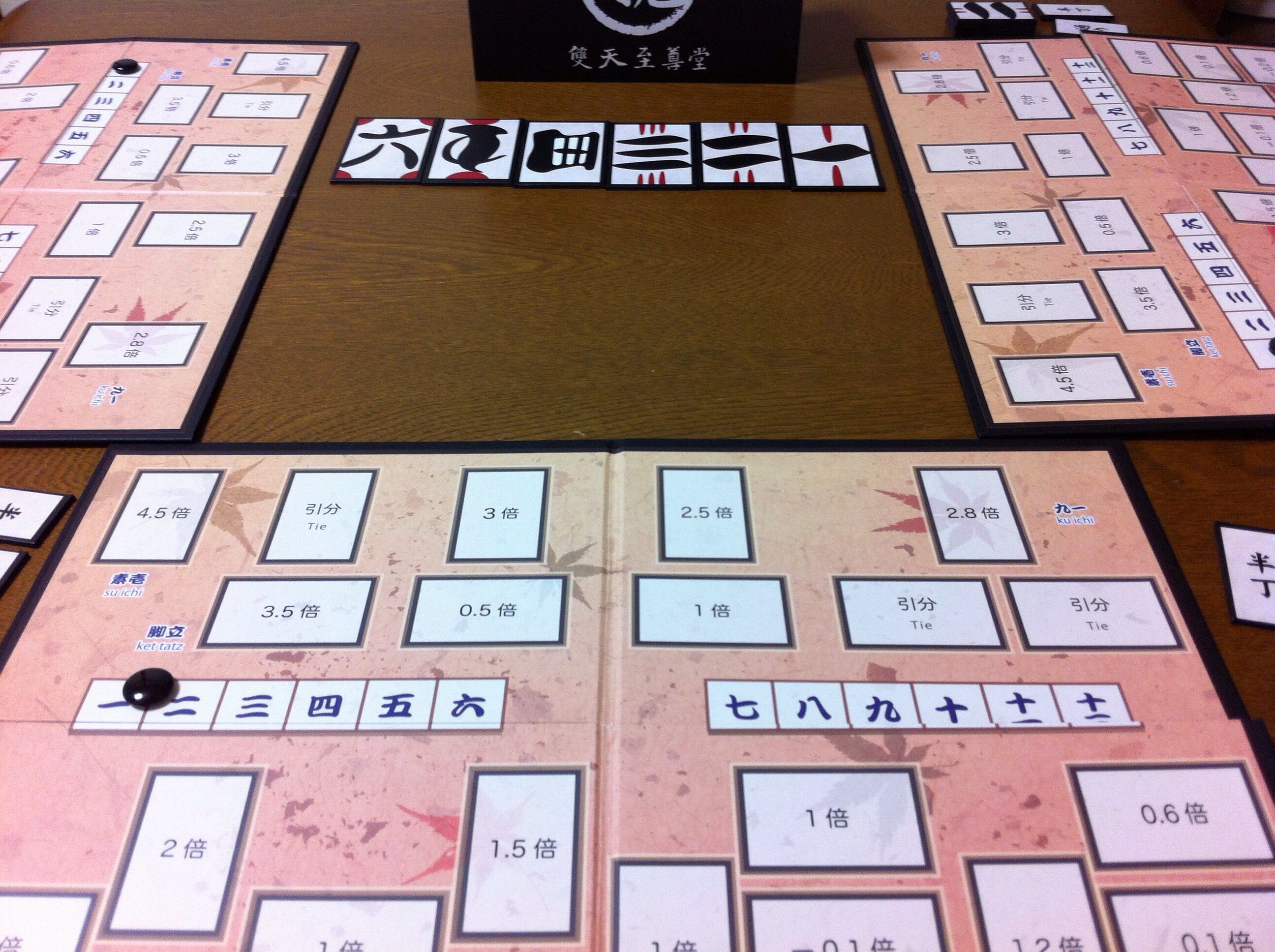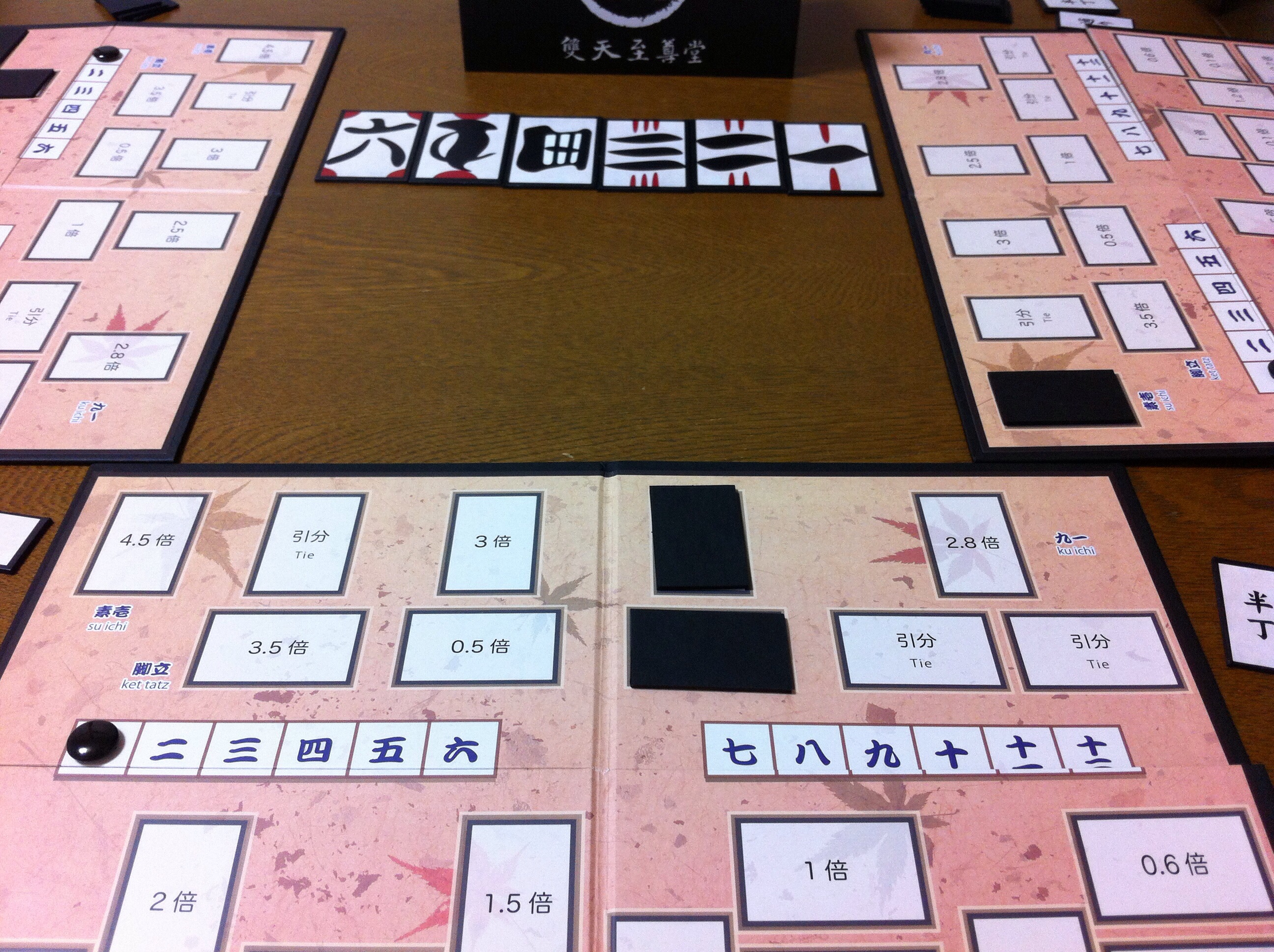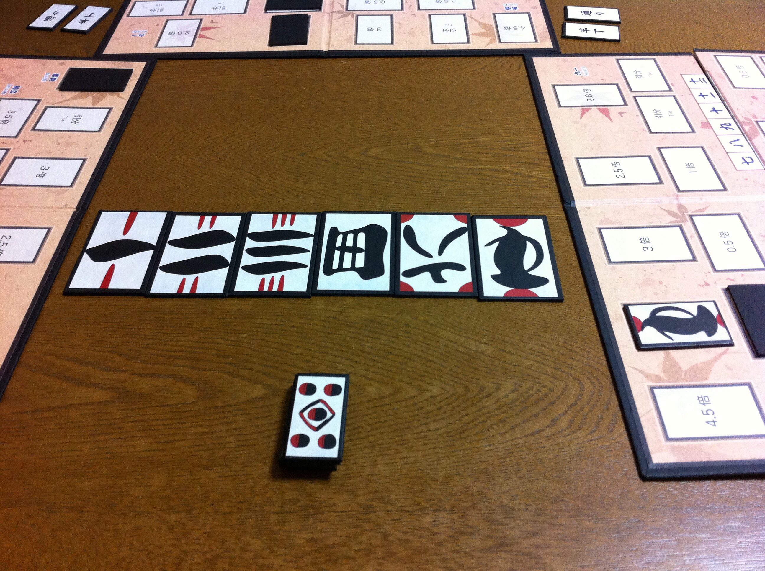 「勝負!」後の、親から見た画像。今回、選んだ札は「五」でした!そして、親から見て右のプレイヤーが見事、予想を当てています!!なぜ、バレたし(汗