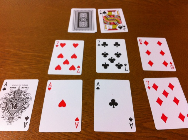・ただし、あるマークのカードがAしかない場合、そのAのカードの上側にこれから出すカード1枚を置きます(縦に2枚、同じマークのカードが並びます)。