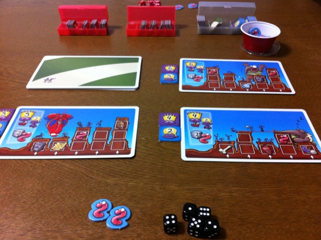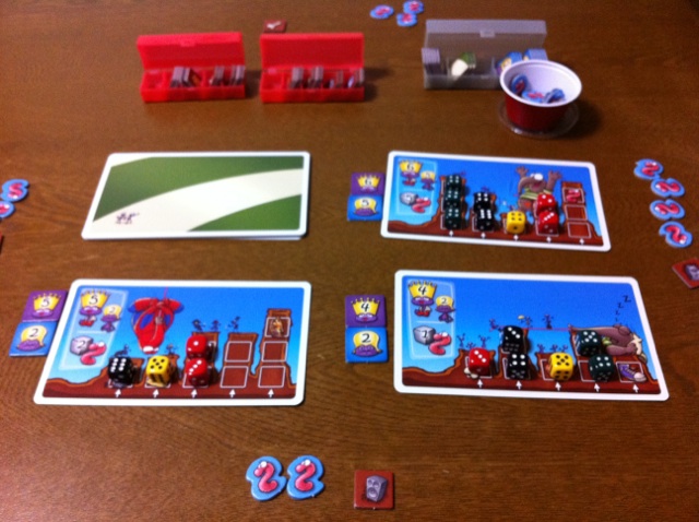 自分の色のサイコロを振って、カードの上に置いていきます。陣地取り・・のような感じでしょうか。ただし、1つのカードにサイコロを置く場所が5列あるのに対して、自分の色のサイコロは左から詰めて、かつ、1列にしか置けません。
