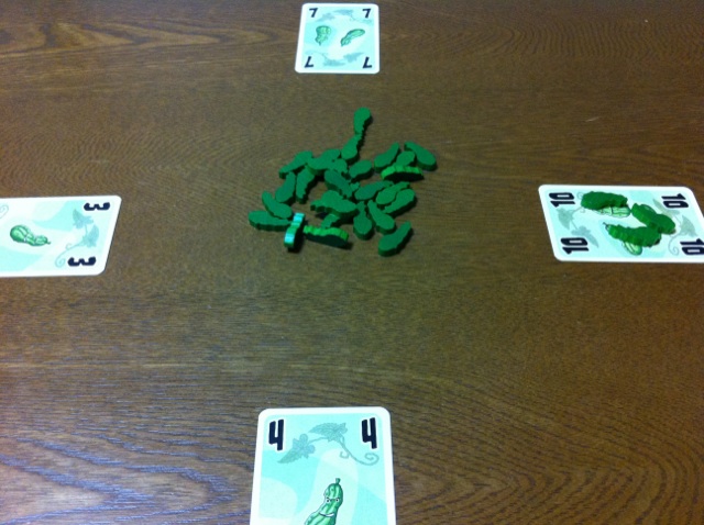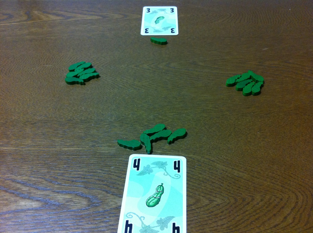 ゲームの終わりの図。数字が大きい方がキュウリを取るので、「4」を出したプレイヤーがキュウリを取ります。なお、キュウリは5本までは持っていても大丈夫なのですが、6本以上でアウトです。つまり、「3」のプレイヤーの勝利です!