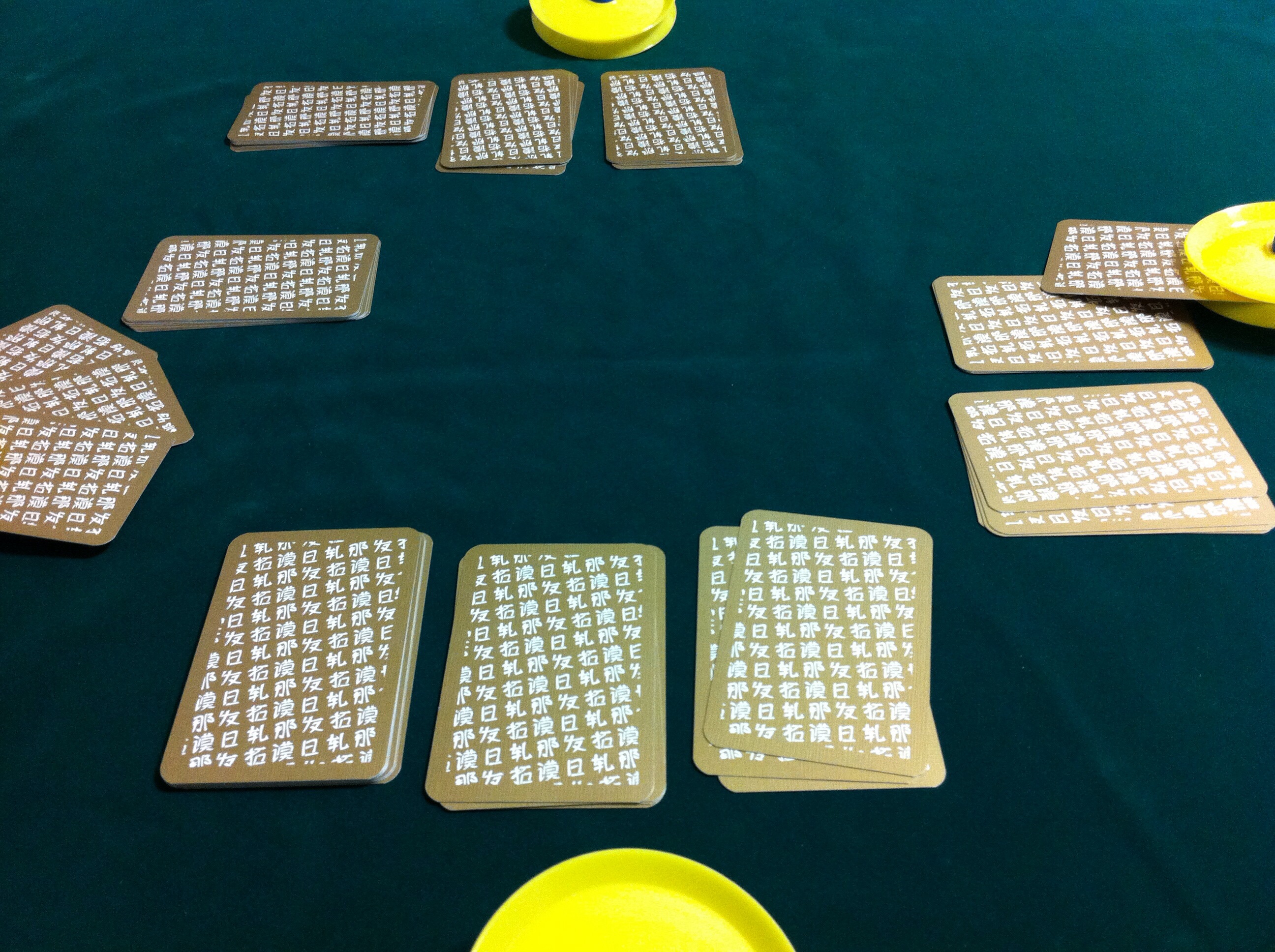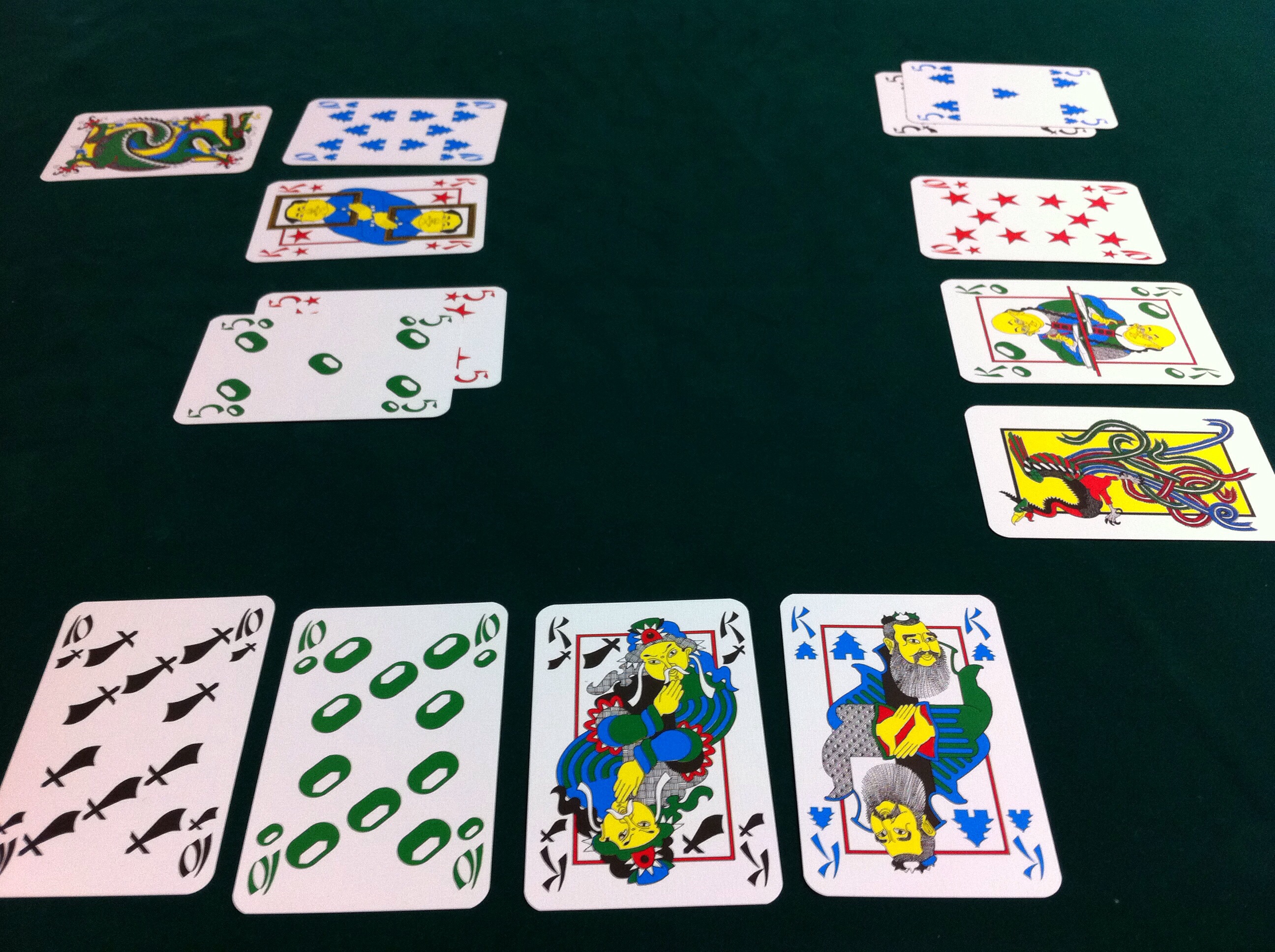 次のゲームでは、片方のペアが先に手札を無くす展開もなく、それぞれのペアに点が入りました。なお、「10」と「K」が10点、「5」が5点、「龍」が25点、「鳳凰」がー25点。あとは全て、どれだけ取っても0点です。なので、手前のプレイヤーが40点(奥が0点)、左右のプレイヤーが合わせて60点です(ラウンドの合計点は必ず100点になるので、ある意味、計算が楽です)