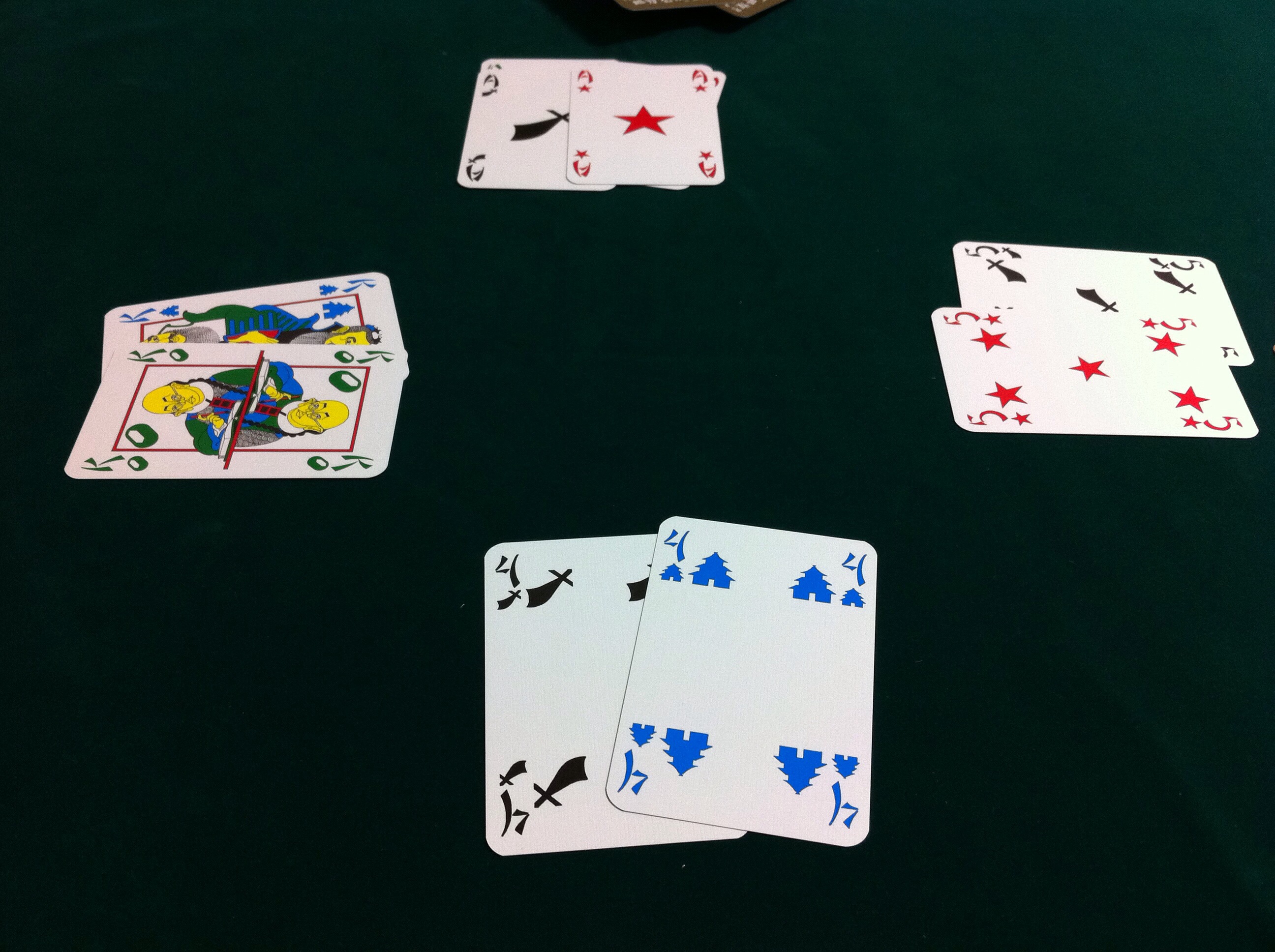 トリックテイキングというか、大富豪/大貧民というか、ポーカーもしくはラミーキューブ的というか、色々と混ざった感じは嫌いじゃないです。特殊カードやカードの役やボムという概念はありますが、麻雀に比べれば、全く苦じゃないレベルだと思われ。ちなみに、下の画像だと、A(数字の中では最強)の2ペアを出した奥のプレイヤーが、このトリックの勝者です!