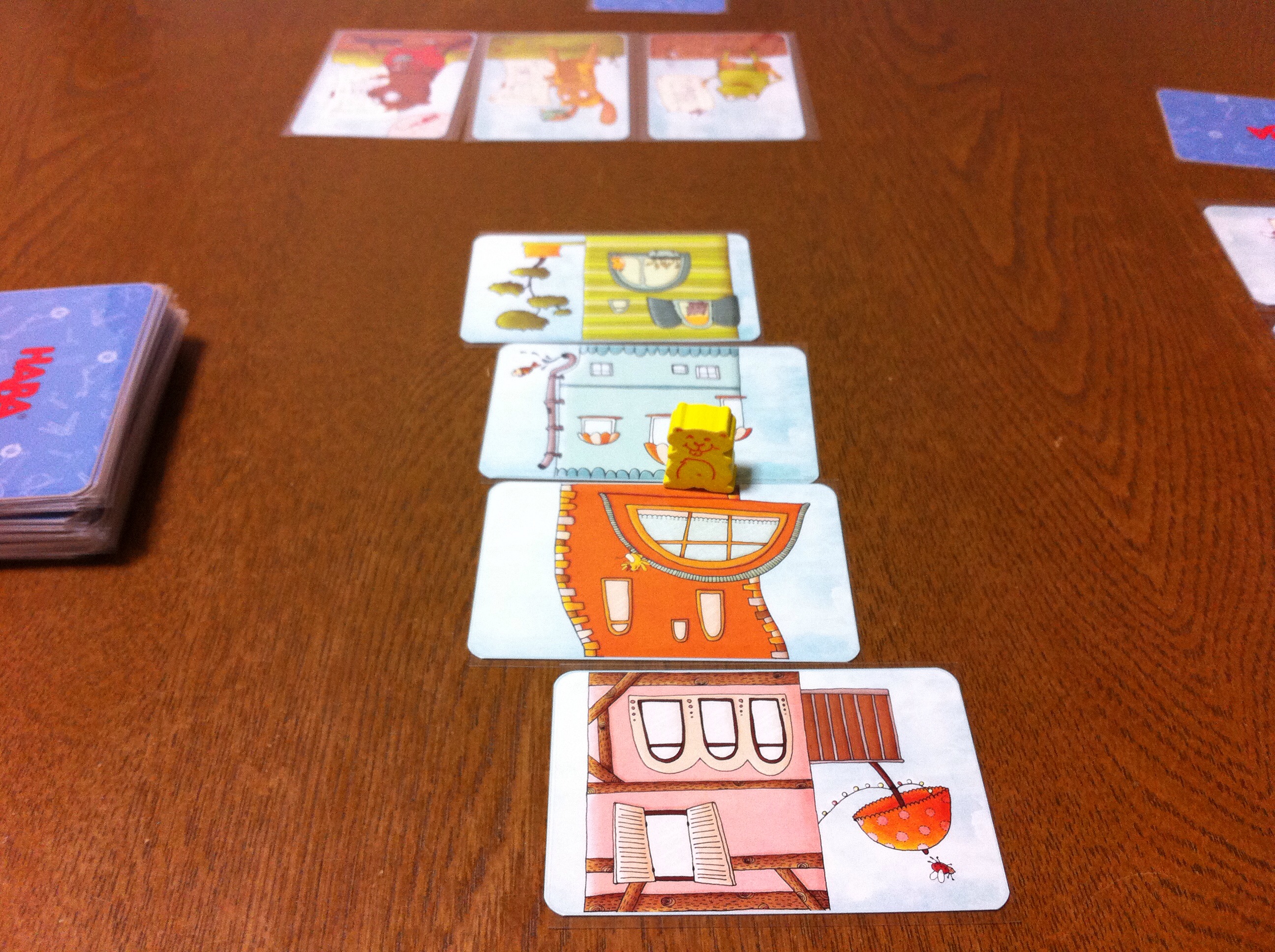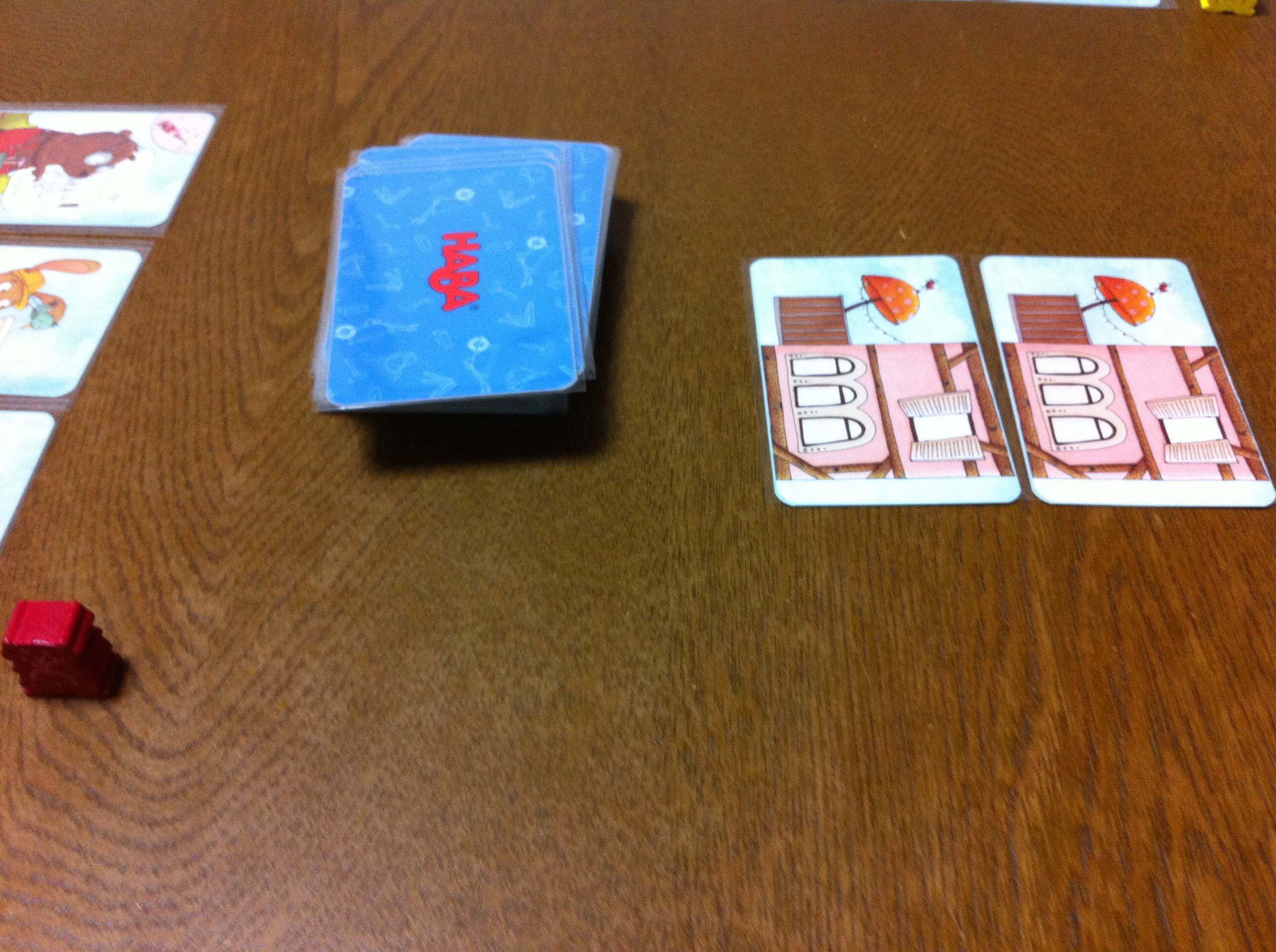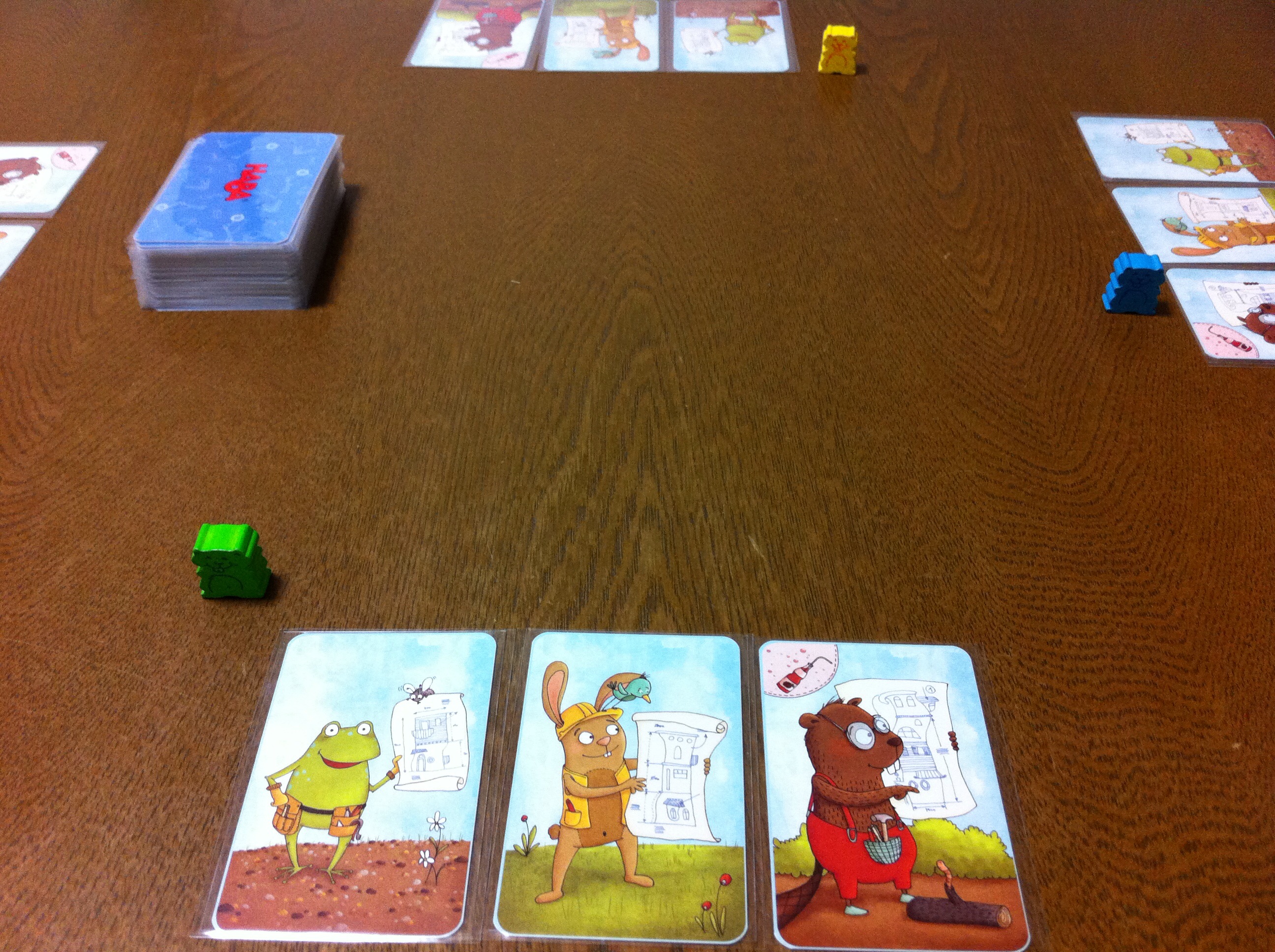ゲームをしている図。二人専用のアブストラクトゲームです。なぜだか知りませんが、ひたすら牛を集めます。たしか、牛泥棒なんだっけ?