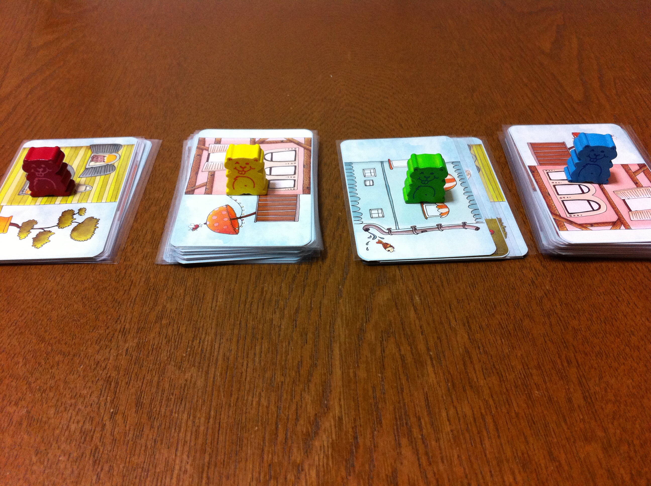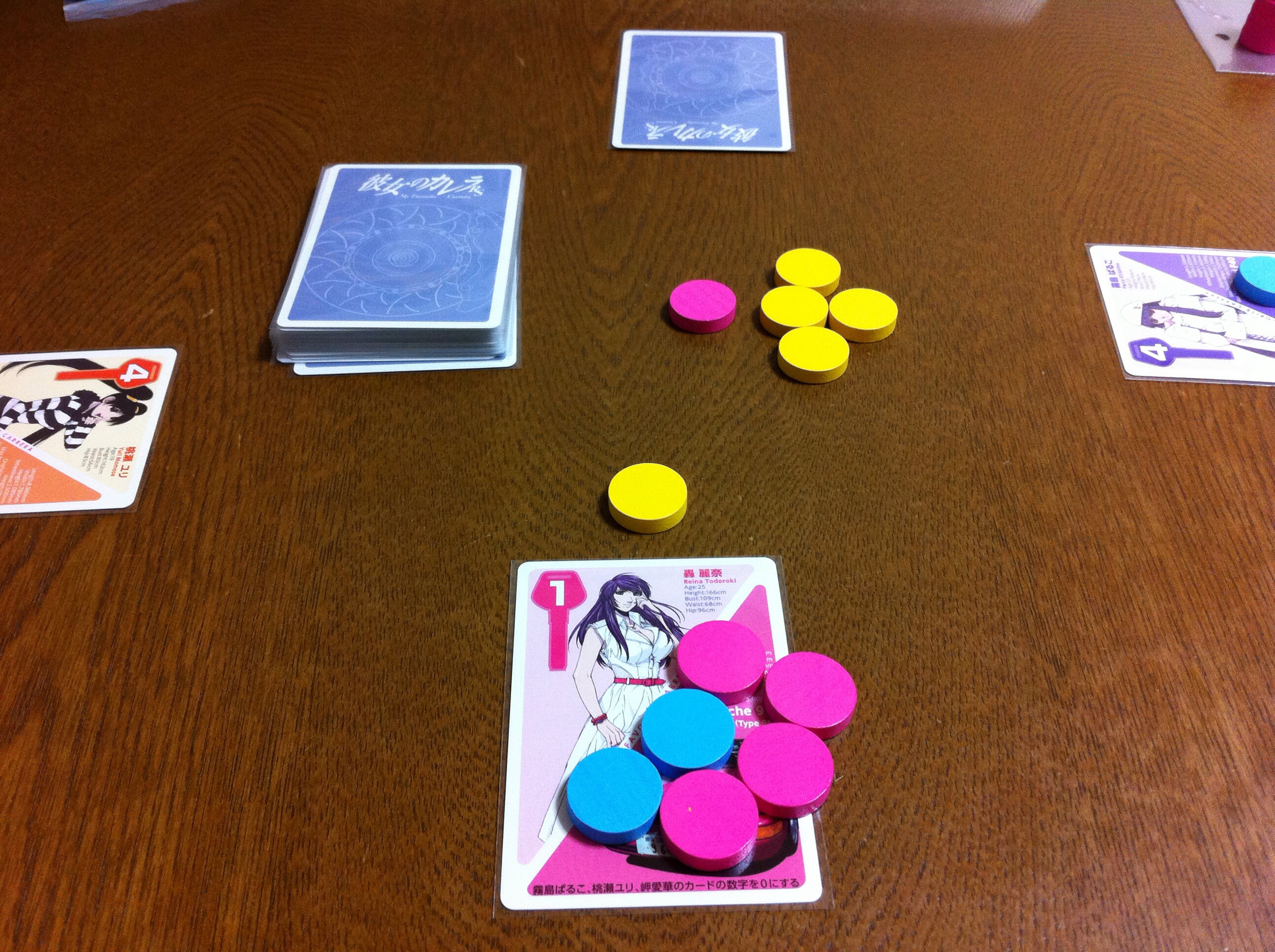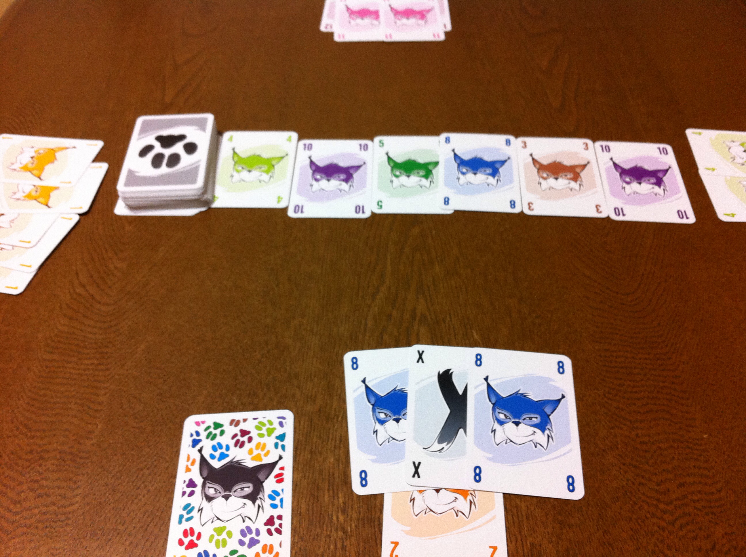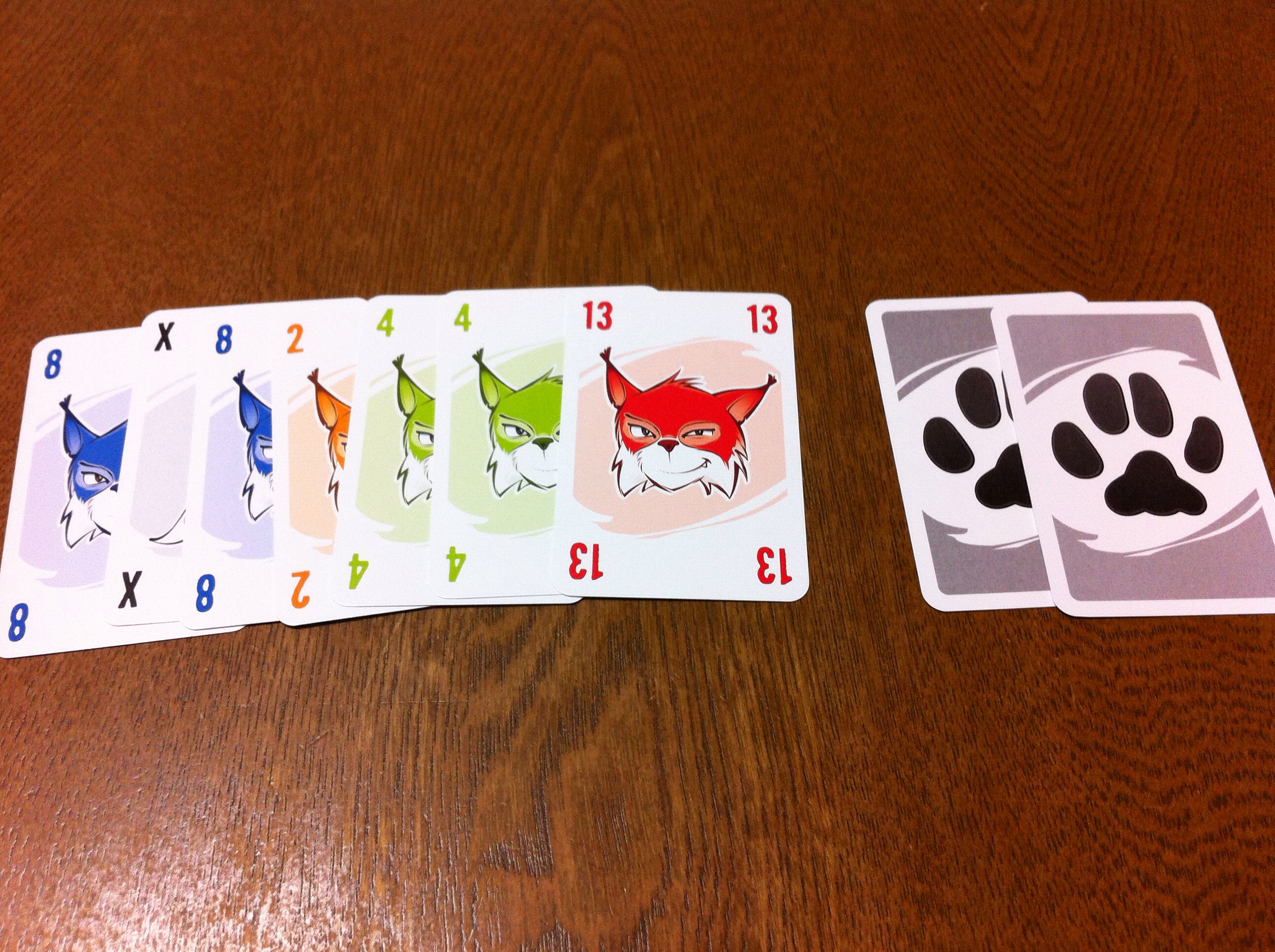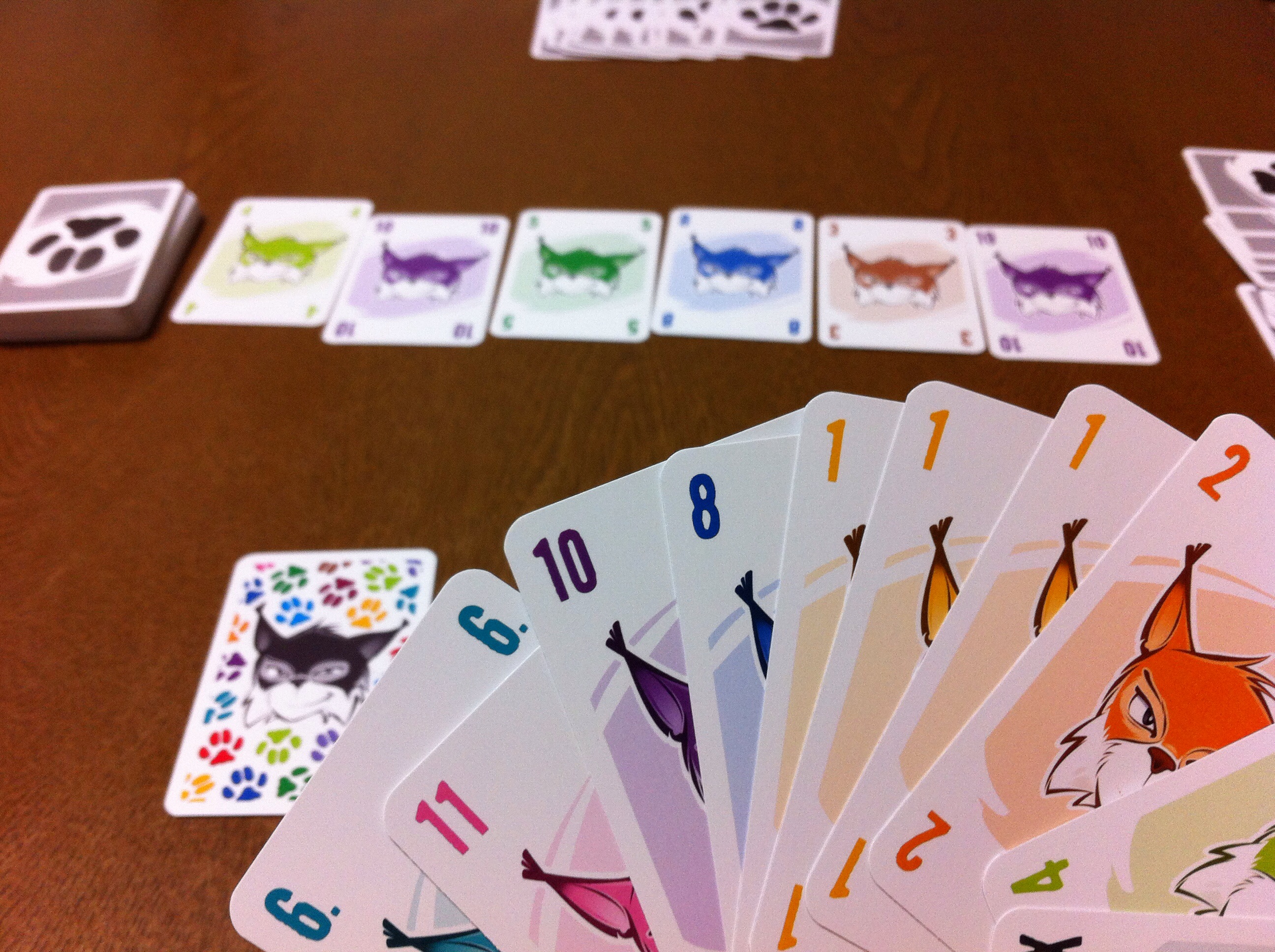 最終的には、目の前に出したカード(1枚=プラス1点)と手札に残ったカード(1枚=マイナス1点)の差で勝負します。もちろん、点が高いプレイヤーが勝利します。