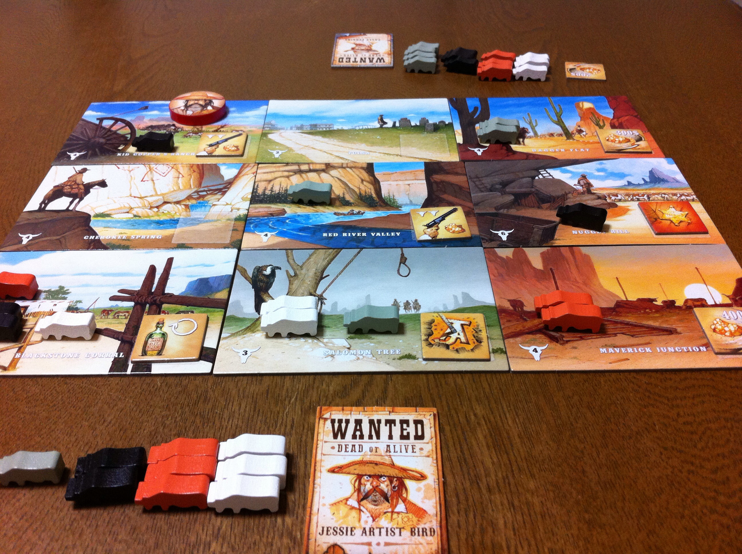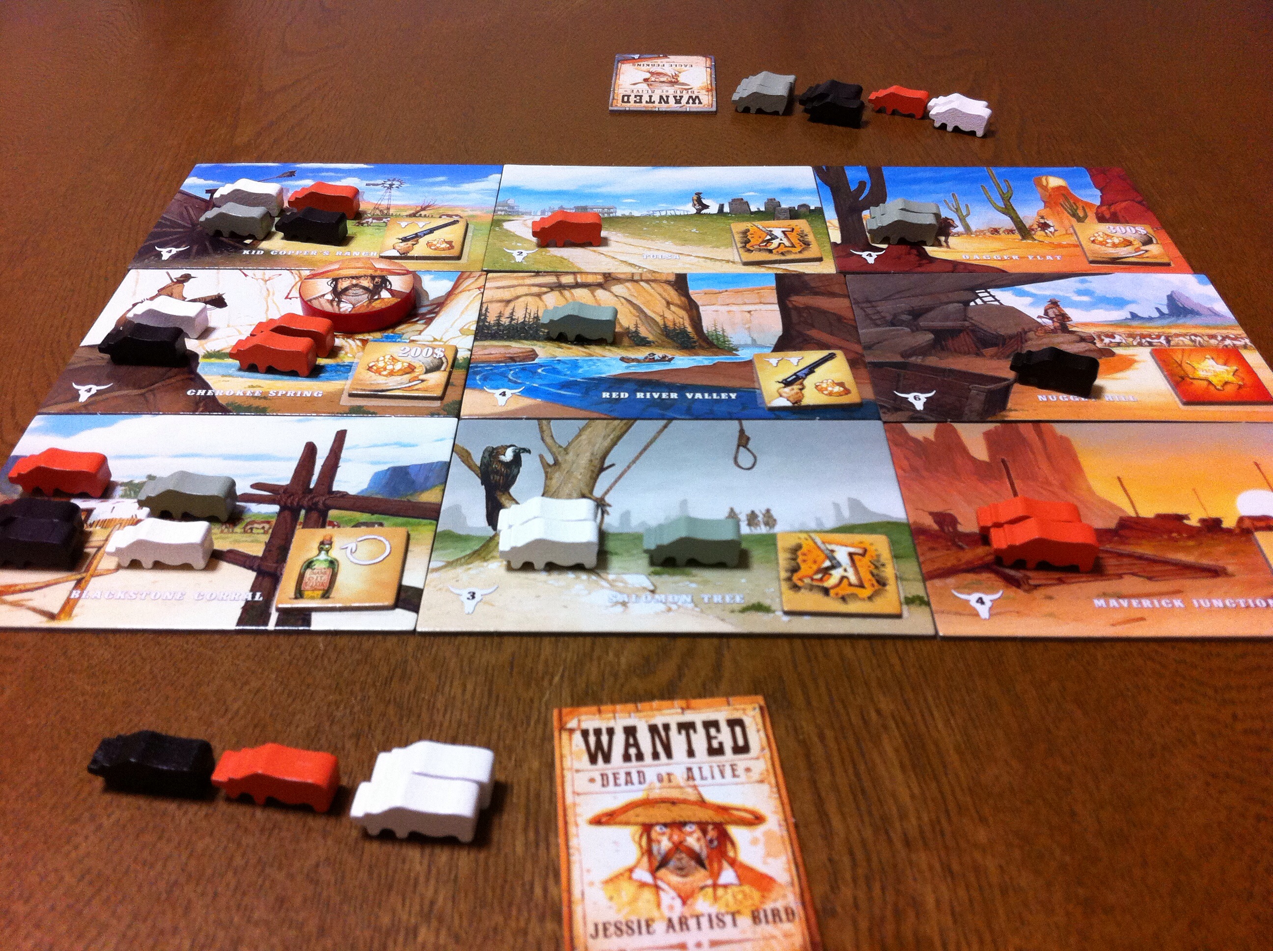 ゲーム終了の図。コマがどこにも動けなくなった場合、ゲームが終了します(他にも終了条件が2つあります)。そして、やはり牛を数えます。・・・悪党は、牛好きなのかな?儲かるの?