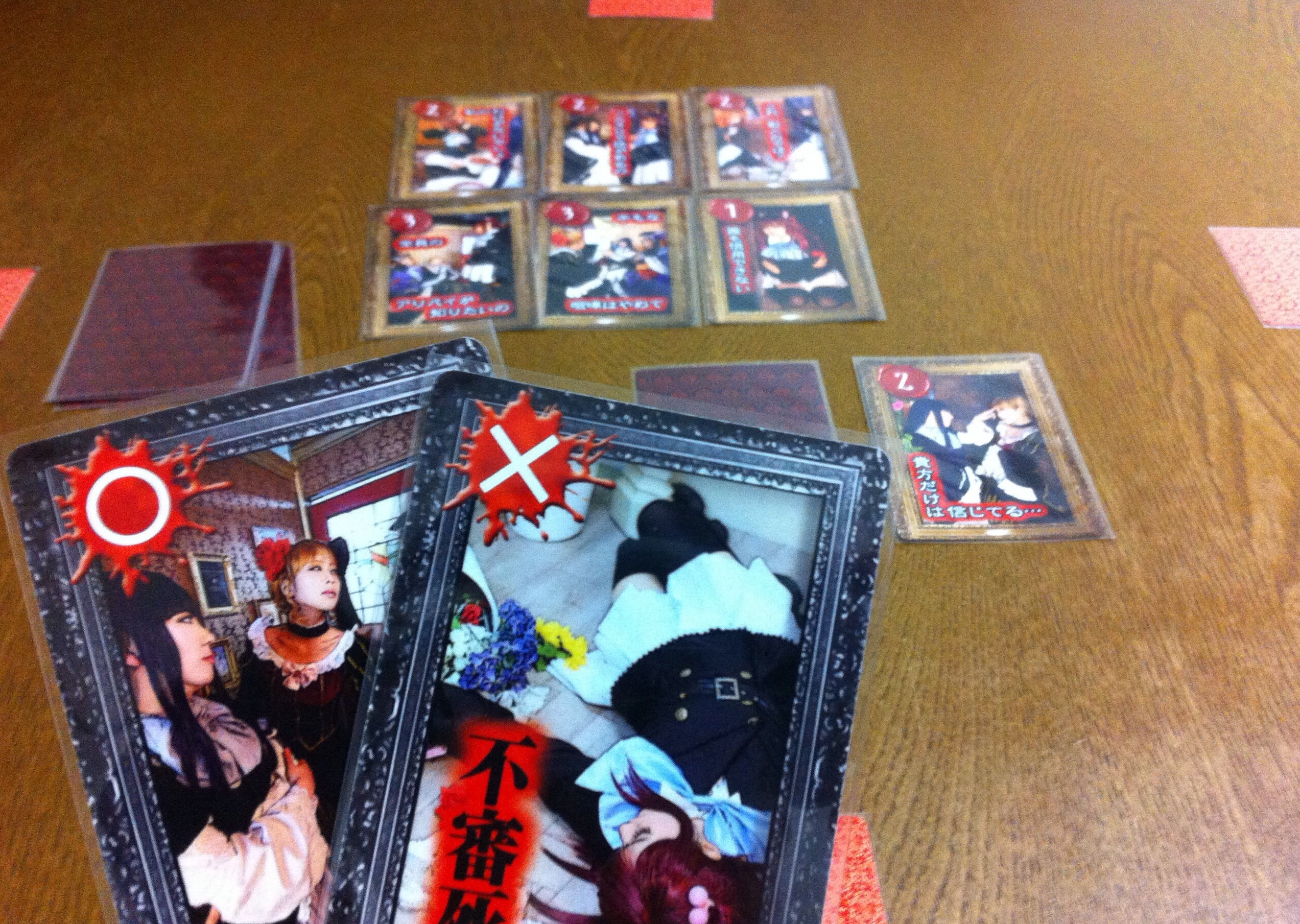 基本的に、ふんわりレジスタンス:アヴァロンです。あと、ワンナイト人狼も入ってるんでしたっけ?たとえば、2時間が無事に経過できたかどうかの判定を、2人のプレイヤーを選んで決めます。該当するプレイヤーは「成功」か「失敗」かを投票するわけなんですが、犯人は「失敗」を選べます(1つでも「失敗」があると、時間が経過しません)。さらに、該当のプレイヤー以外に、毎回ランダムに1枚投票されます(つまり、事故死があります!)