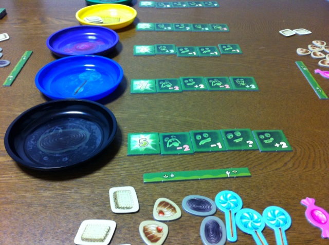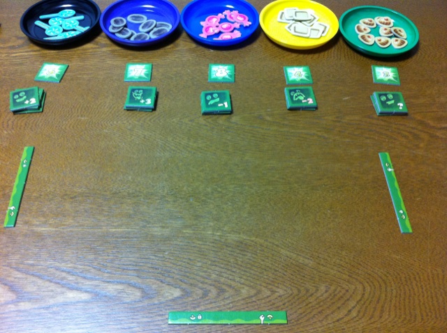 スタートアップの図。5種類のお菓子の価値が、各プレイヤーの出すタイルにより決まります。が、はじめは何のタイルを出したか分からないので、はじめから表示されている各お菓子の得点と、他のプレイヤーの動向を見ながらお菓子を取っていきます。