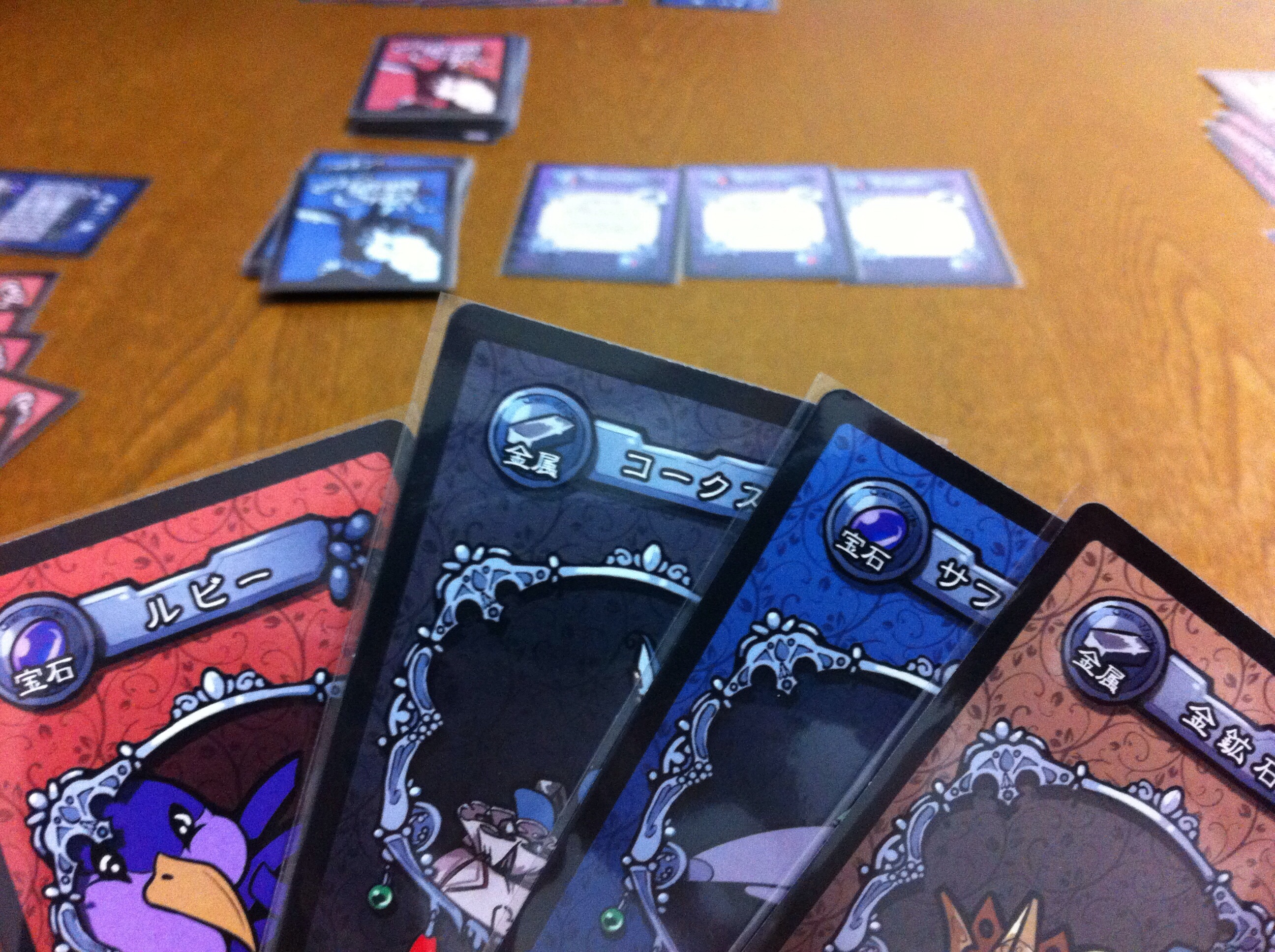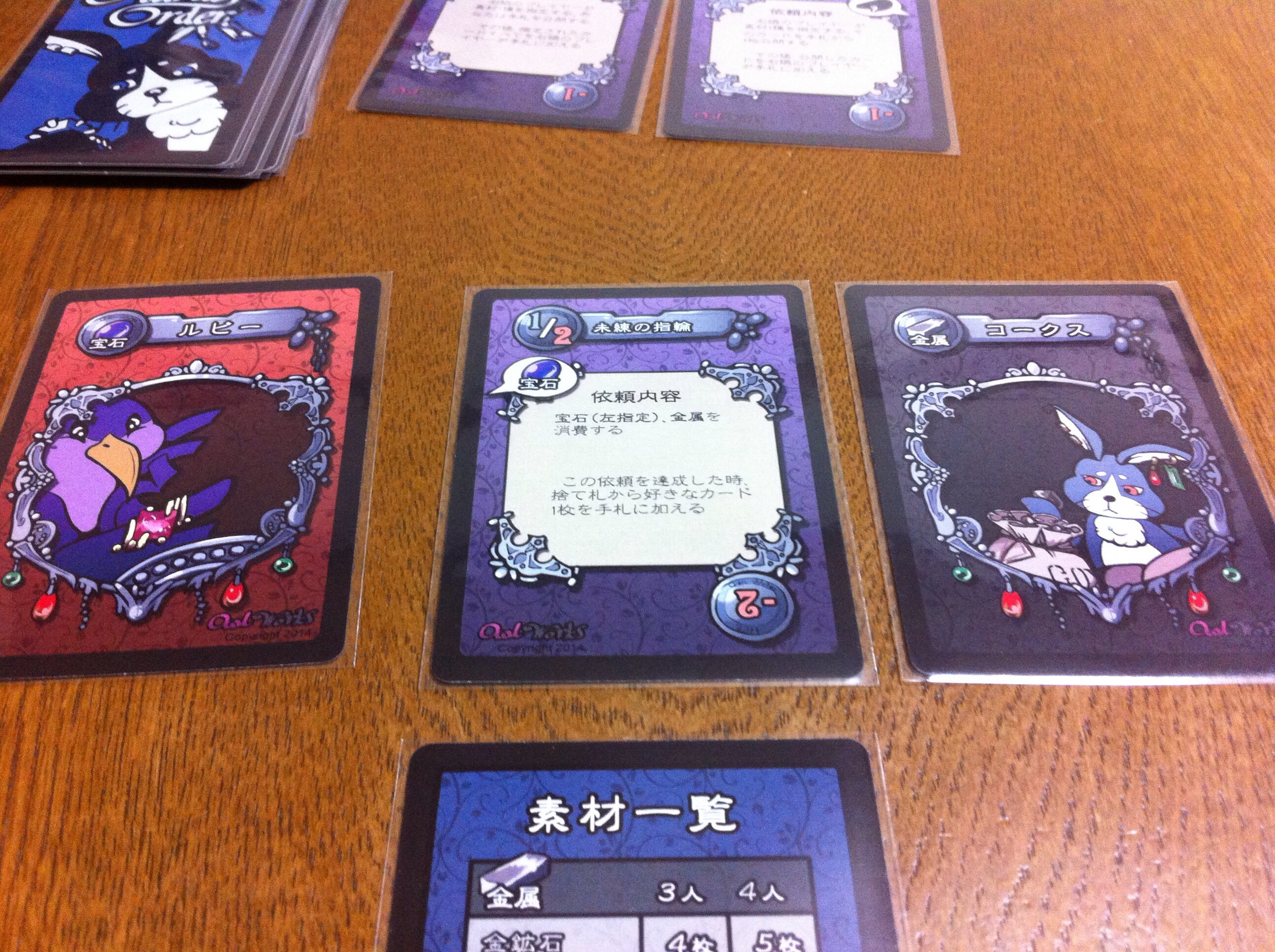 ゲームのスタートアップの図。照り返しが強くてよく見えませんが(汗)、テーブル中央の3枚のカードがオーダーカードで、このカードを達成して点を得るのが目的です!