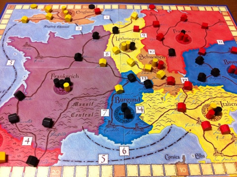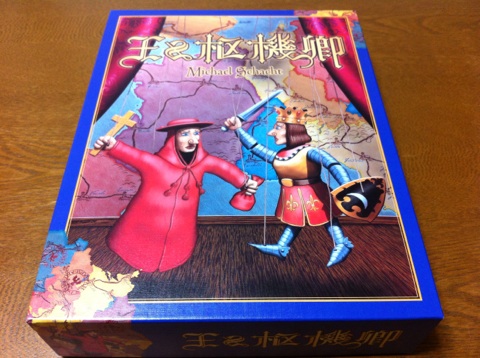 箱:中箱と大箱の間くらいの箱です。日本語版として大復活を遂げた「王と枢機卿」ですが、オリジナルのドイツ語版にはなかった拡張要素がいくつか入っています。