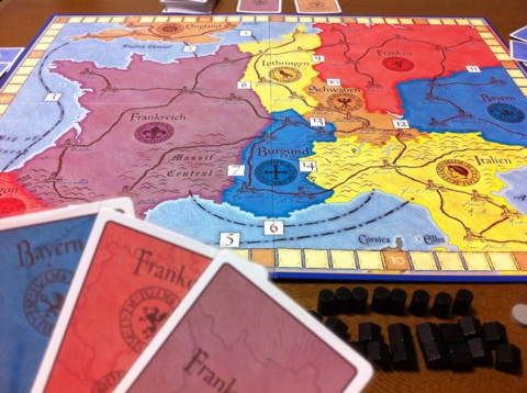 スタートアップ(ボードとコマとカード)の図です。それぞれ、しっかりしたモノなので、ボードゲーマーとしては遊ぶ前から心躍る感じです★