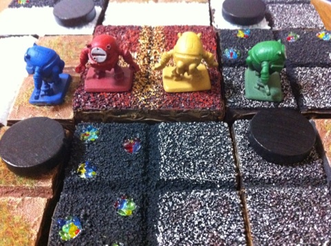 ↓一つだけあるロボットコマは、オマケだそうで・・・豪華版を持っていないオシノは悔しいので、社長コマ(プラの赤コマ)の代わりに、ロボットを社長に見立てて遊んでやります!