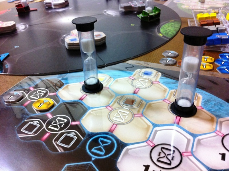 ゲームが始まったら、手番はありません。ひたすら砂時計をひっくり返し、砂が落ち切ったらアクションをします。もう、忙しくて目が回ります(笑