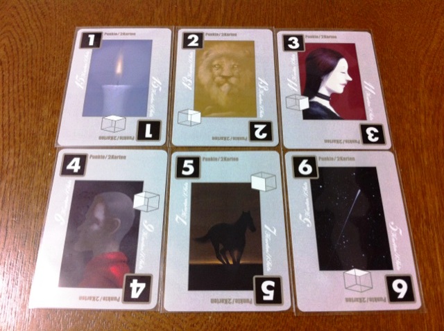 ゲームで使う6枚のカード。それぞれ奇数分用意されているので、ゲーム終了時には、以下の1枚ずつが必ず余るという「アンジェレイド(奇数)」ゲームです。