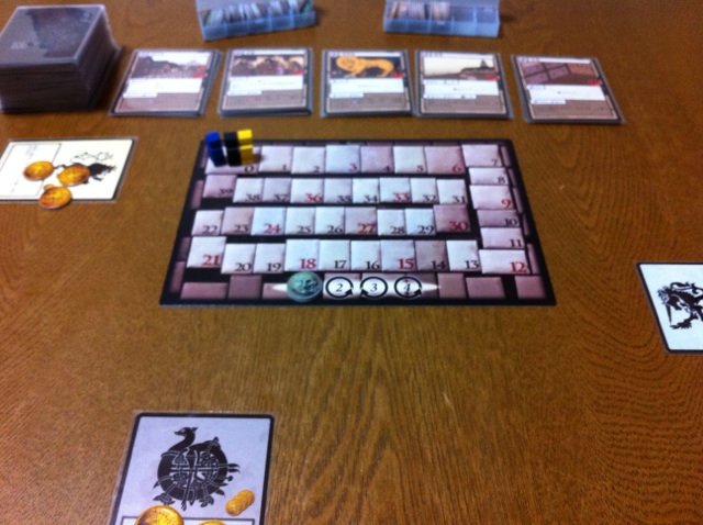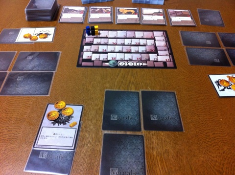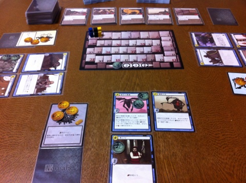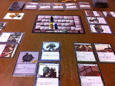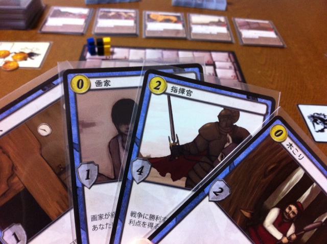 1回目の戦争です!コストをたくさん払ったので、この戦争には勝てるはず!ちなみに、カードの上に乗っかっている緑色のチップは「経年カウンター」です。