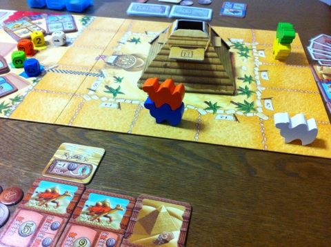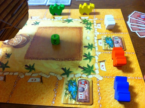 サイコロを振ると、緑の1でした。この後、黄色いラクダの上に緑が乗っかります。それでも追い付けるかどうかは・・・ダイスのみぞ知る、ですね。