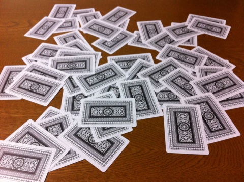 全員の手が届く位置の中央に、使用する全てのカードを裏返しにして、ある程度大きい範囲でバラバラに置きます(以後、これを『場』と呼びます)。