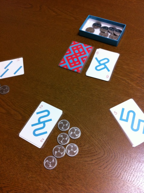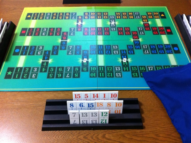 ↓ボードに数字を並べていきます。7並べの変則版?みたいな感じ。タイル立ては、別のゲームで利用しても良い感じの小さくて使い勝手の良いタイプ。
