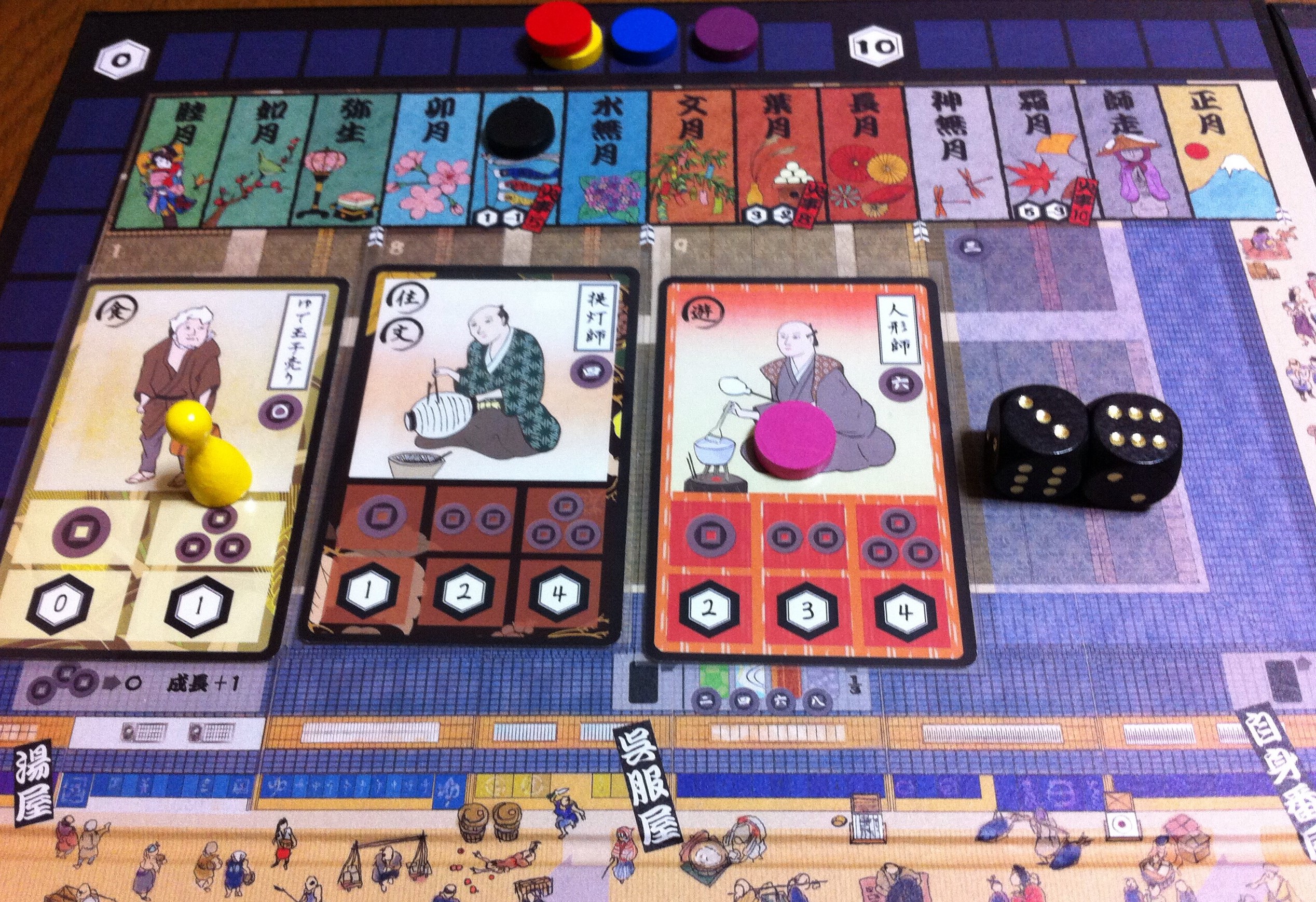 スタートアップの図。今回は4人プレイです!江戸の職人となり、1年間で最高に「粋(いき)」な江戸っ子を目指しましょう~