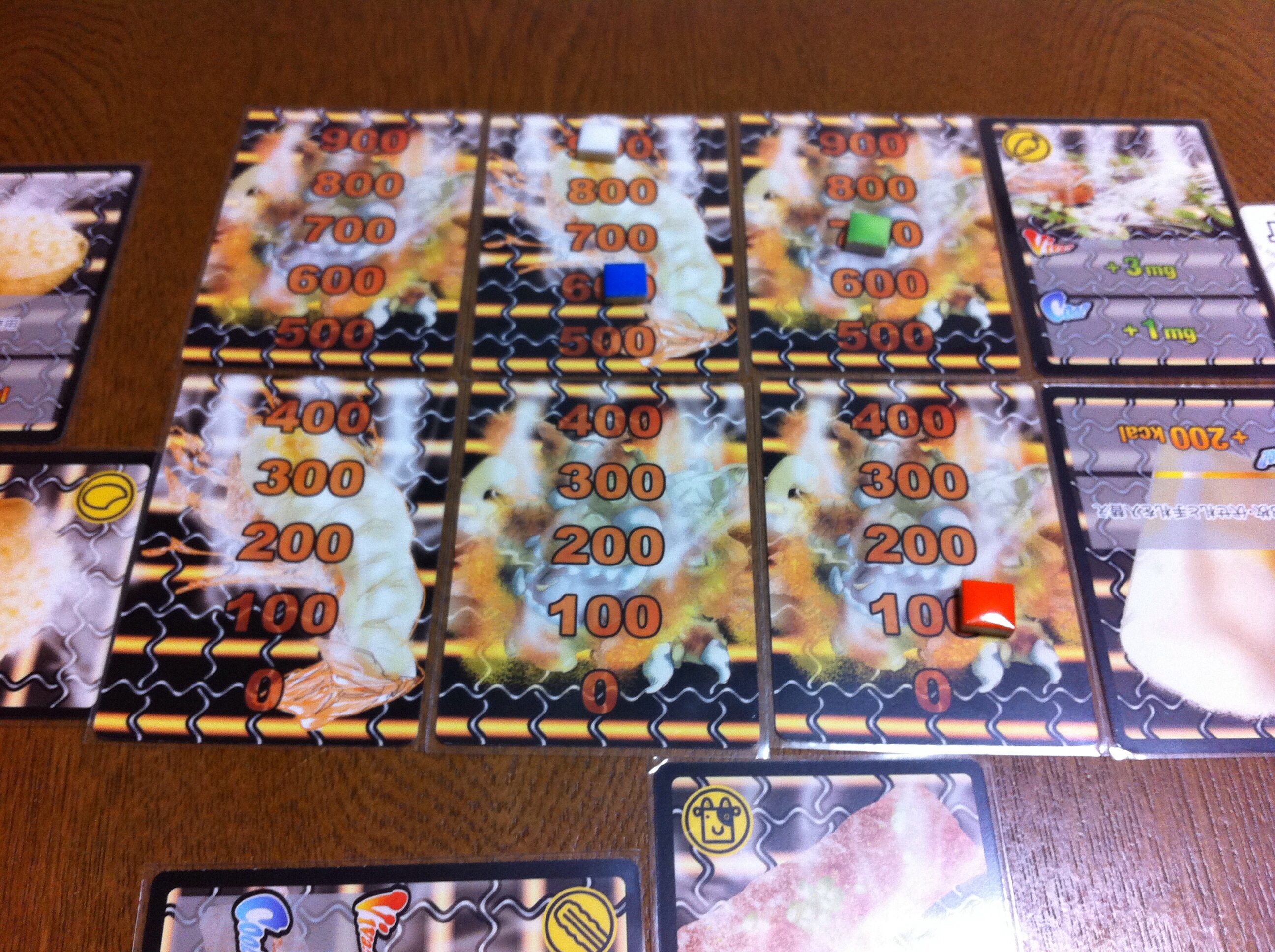 スタートアップの図。このゲームでは、肉を食べて、ひたすらカロリーを取ります!あ、でも、ビタミン不足は大敵です。まずは、5枚の手札のうち、今回使用する2枚を選びます。