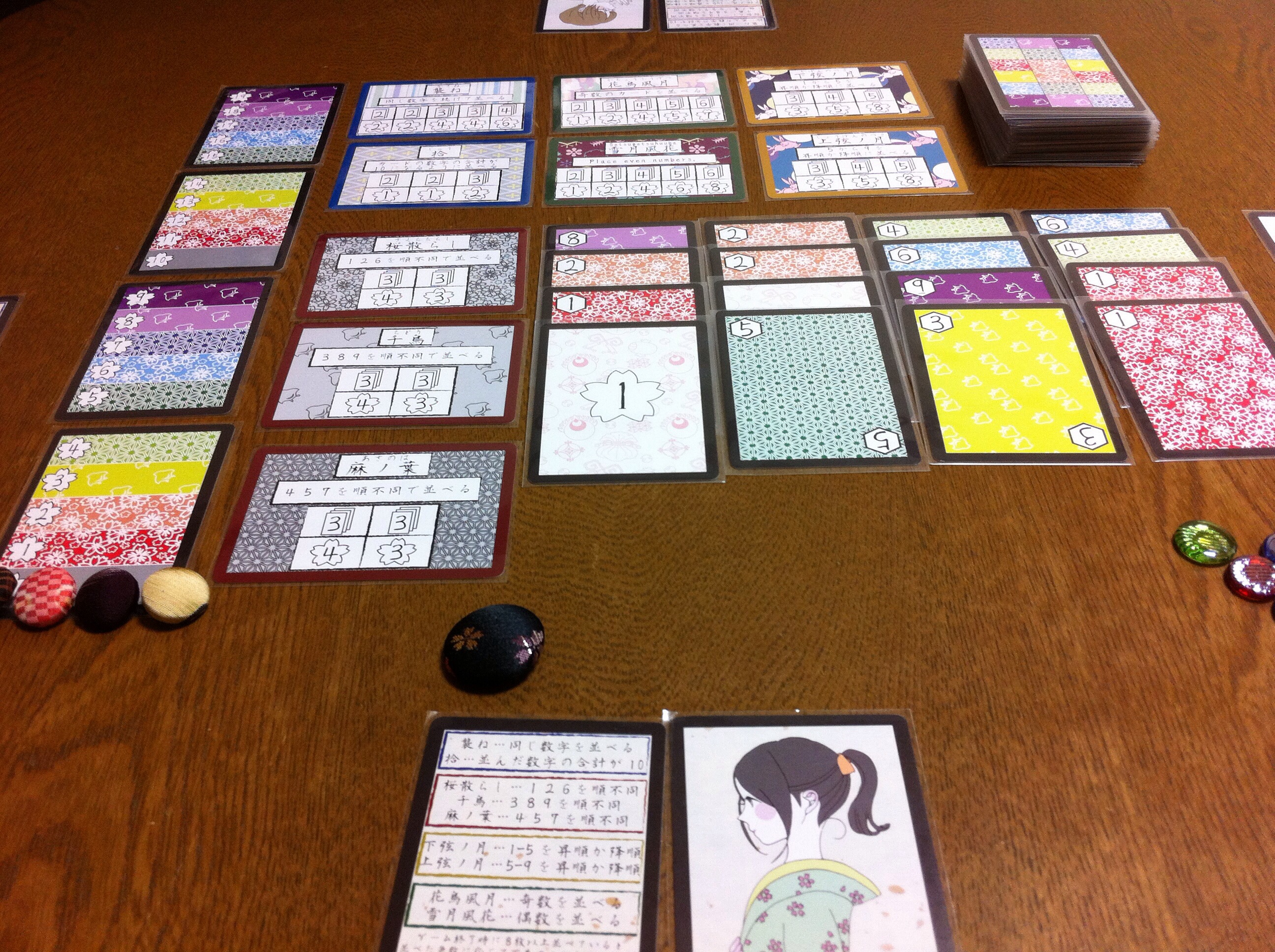 下図のように、キレイ?に一つに並べます。実際に、こんな柄の着物はどうなのかは置いておいて(汗)今回は、手前のプレイヤーが僅差で勝利しました!