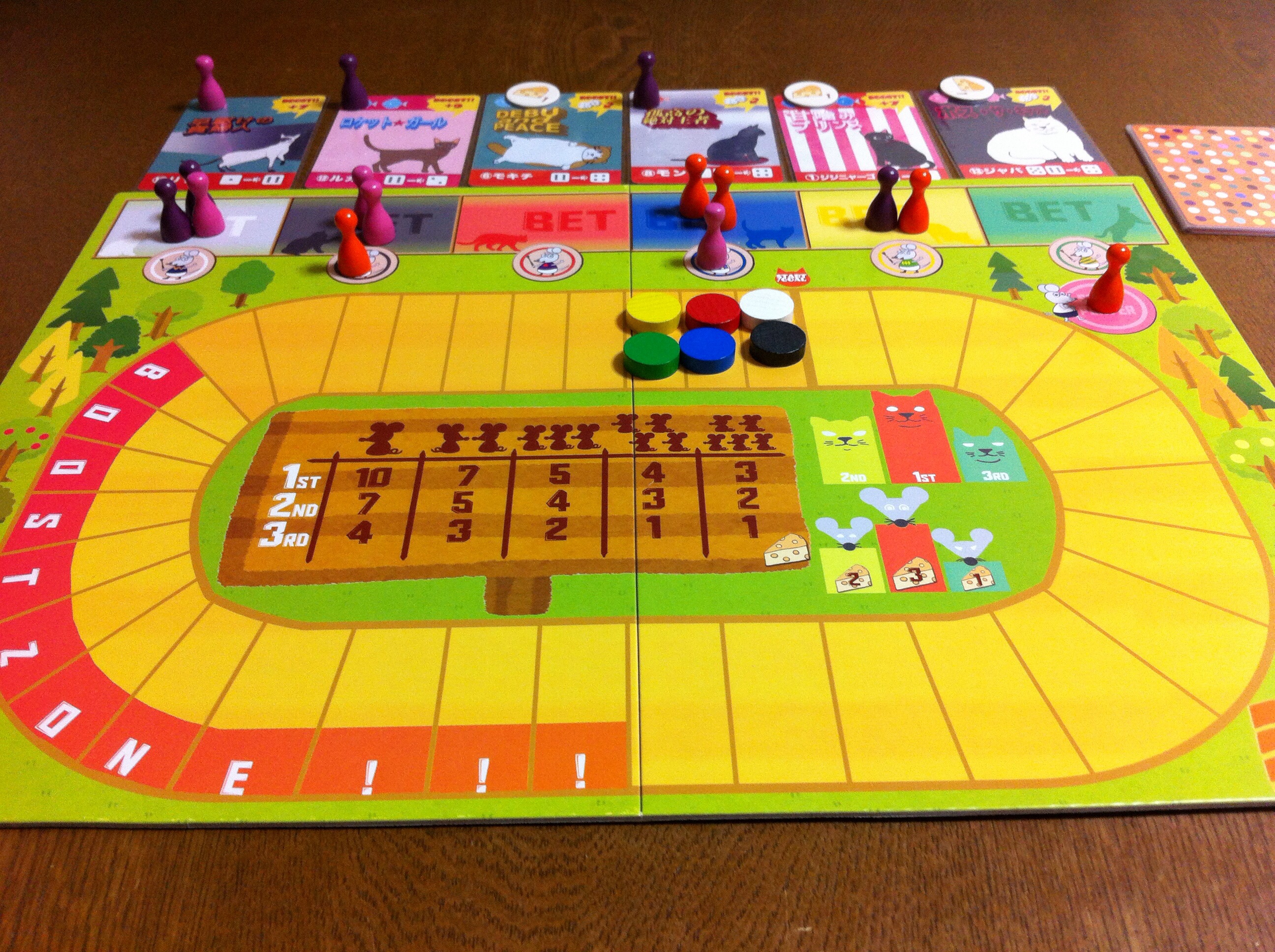 レースが始まる前に、ワーカープレイスメント(自分のコマを狙っている場所に置く)をします。ただ、遊ぶ人数が少ないと、誰がどのネコに賭けているか一目瞭然なわけで・・・汗。4人か5人で遊ぶ方が楽しげな雰囲気を感じます。
