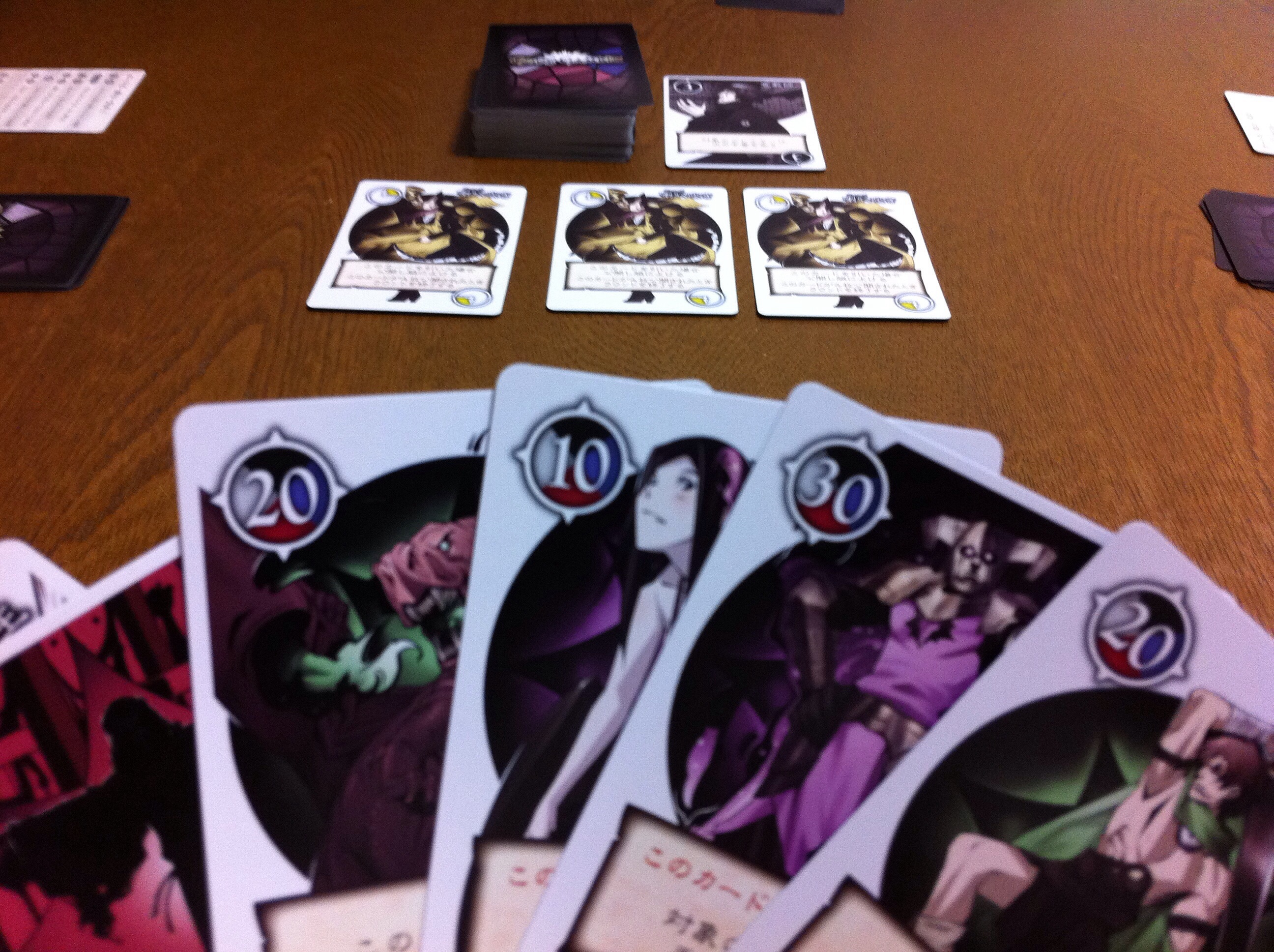 気を取り直して、次のゲーム・・・を始めた途端、ラッパ吹き(4枚溜まると強制的に1ゲーム終了)が3枚に、手札に「20」とか「30」がゴロゴロと・・・涙。こういう大事故的な始まり方もありますよ、このゲーム。ただ、本当に勝てるかなぁ・・・