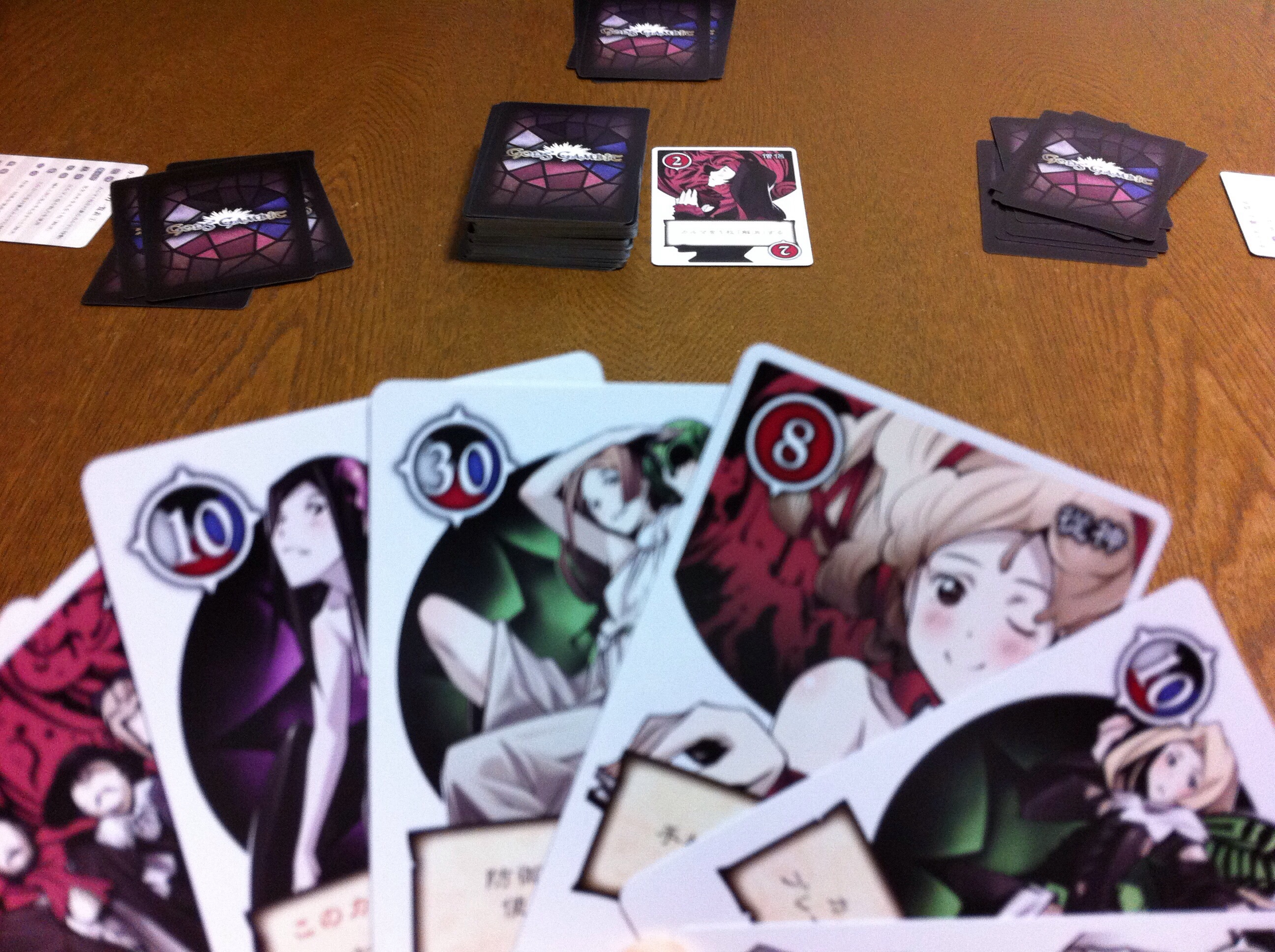 厳密に言うとU・Oではないのですが、手札を早く無くしたプレイヤーの勝ち(プラスマイナス0点)で、それ以外のプレイヤーは、手持ち+自分の目の前に出したカードの数字分だけマイナスを喰らいます!下の図だと、8+8+8+10+30=マイナス64点です(ぐはぁ