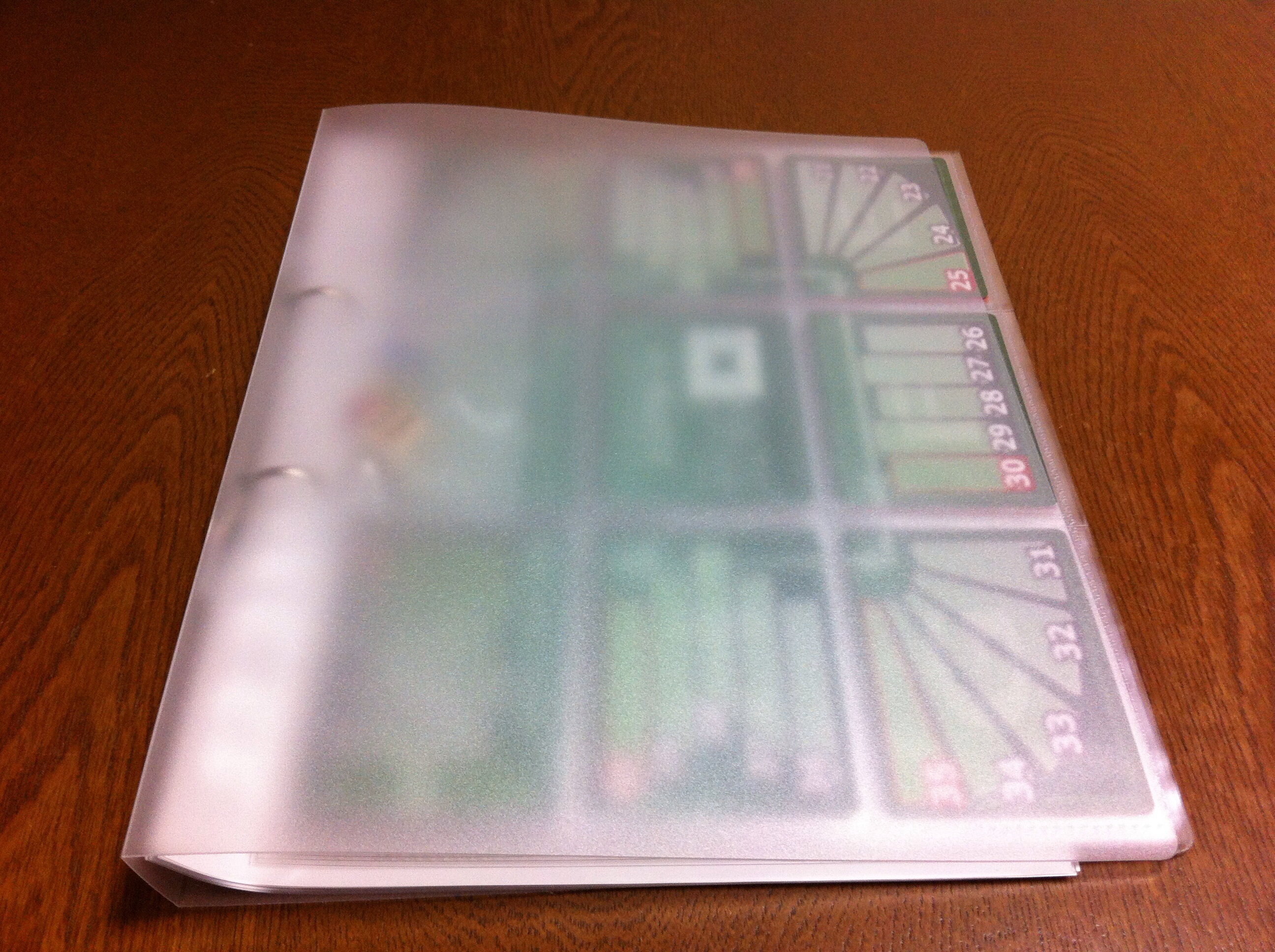 カードをファイルに入れたら、サイコロを振ります。出た目に応じてページをめくり、そこから見える全てのカードに書かれた点を得ます。下の図だと、黄は2+2=4点を得ました。