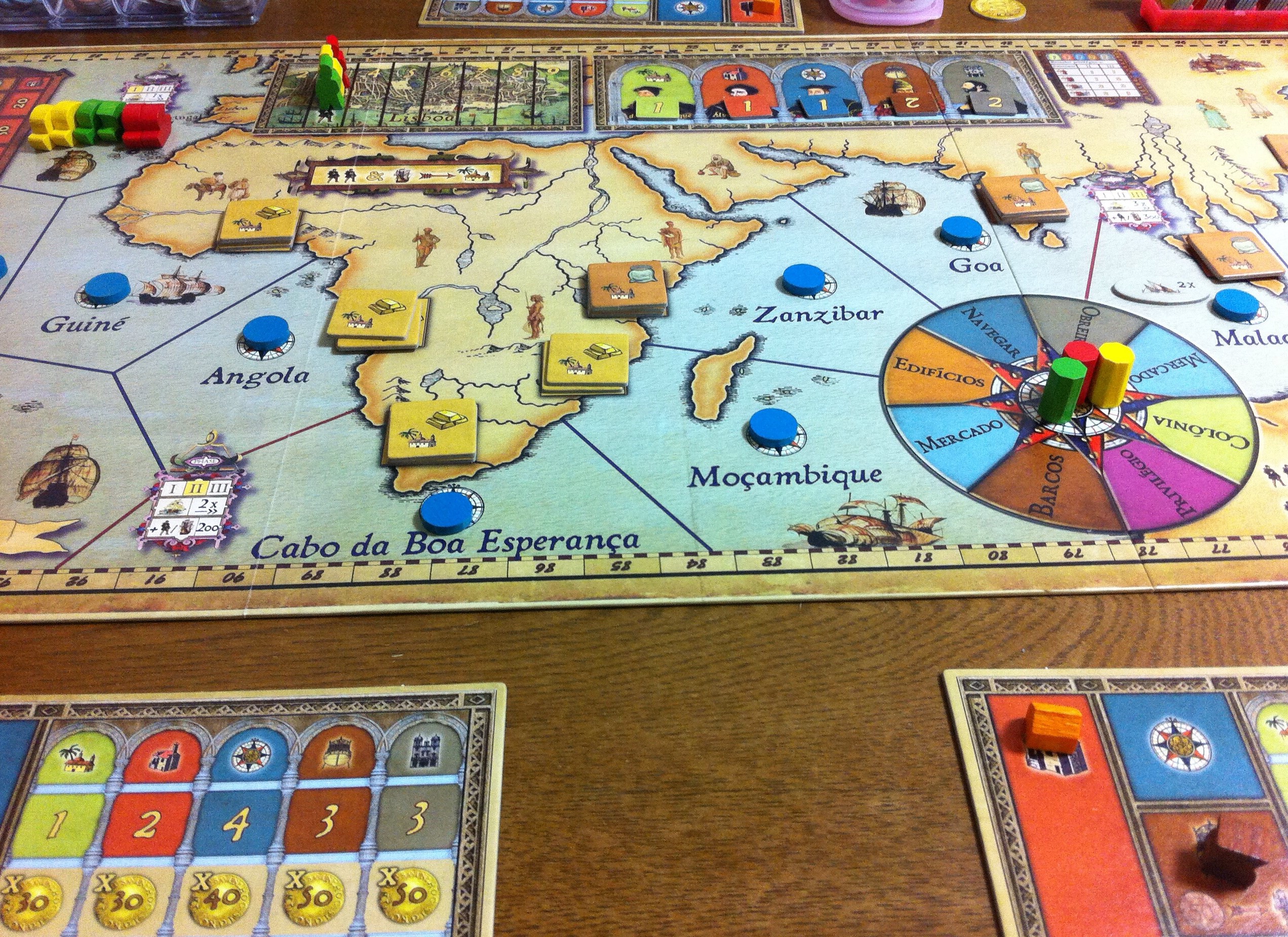 スタートアップの図。今回は3人でプレイします(ウチの狭い机では3人が限界なので。汗)左の3色の船が溜まっている場所から、画像では切れていますが、右端の「長崎」を目指して航海します!特徴はやはり、「ロンデルシステム(右下の円)」で、手番で行えるのは、円の中の1つのアクションのみ!「何だ、簡単じゃん」とか思ったあなたに、この悩ましいゲームをぜひ遊んでほしい。